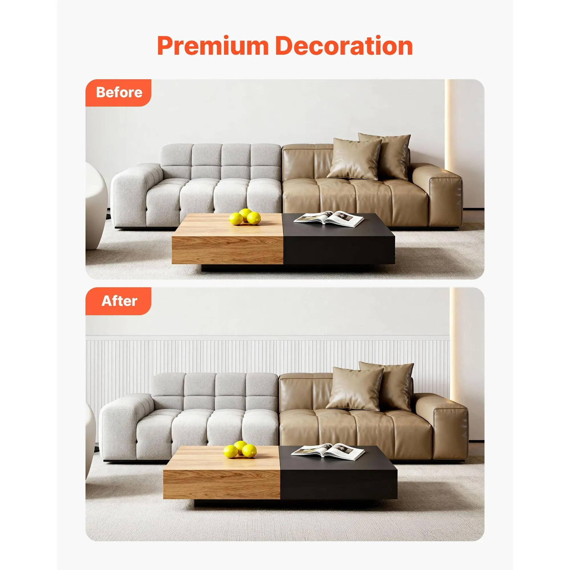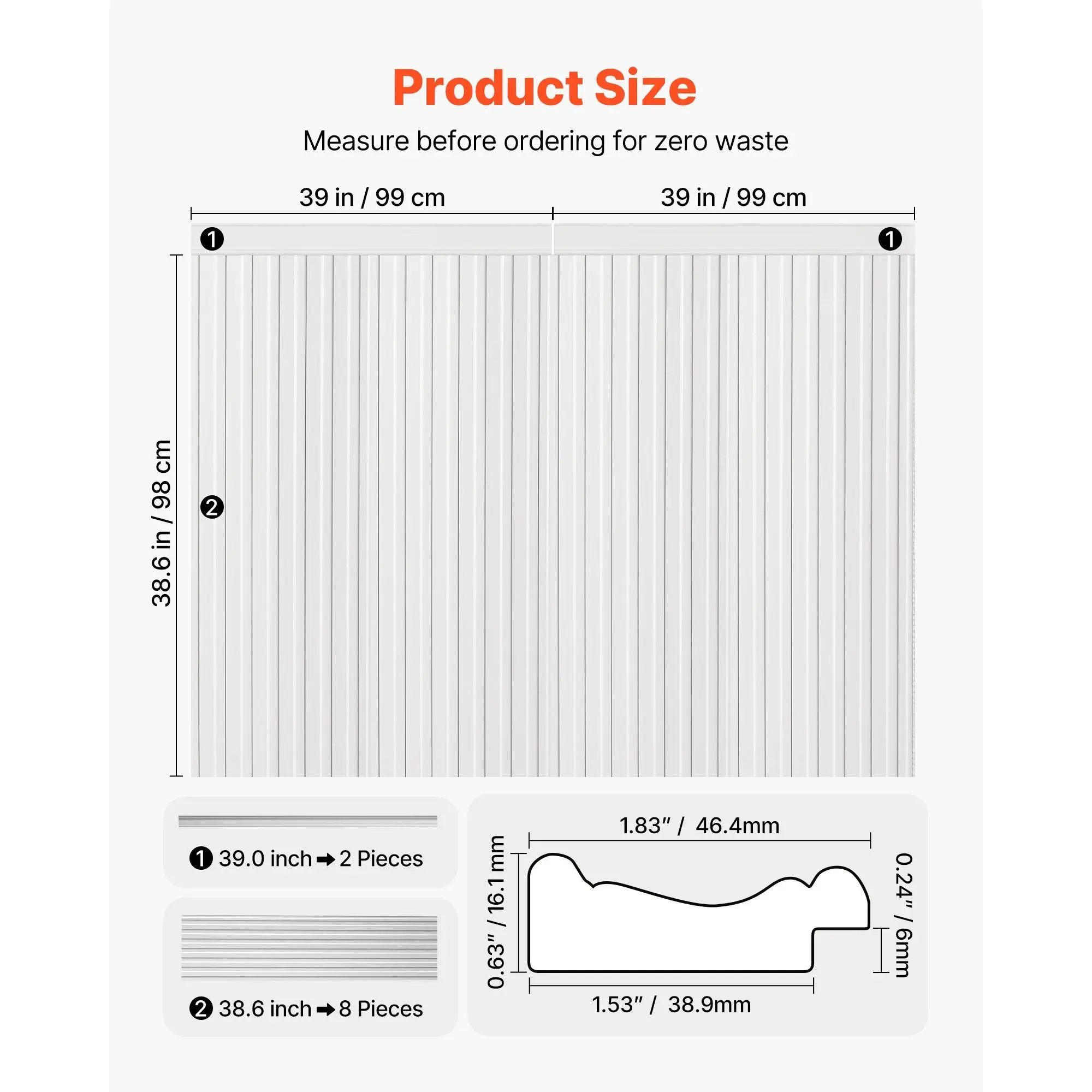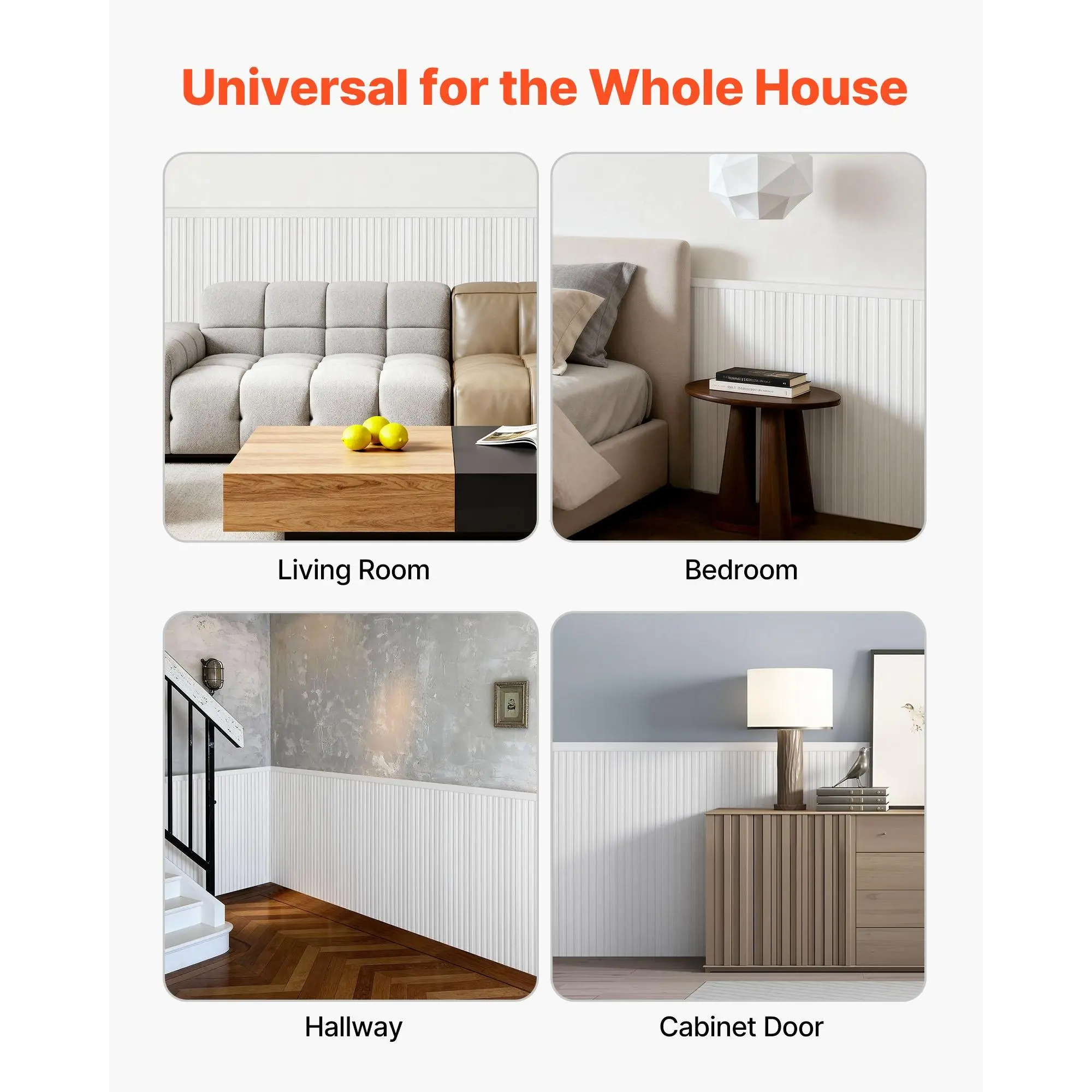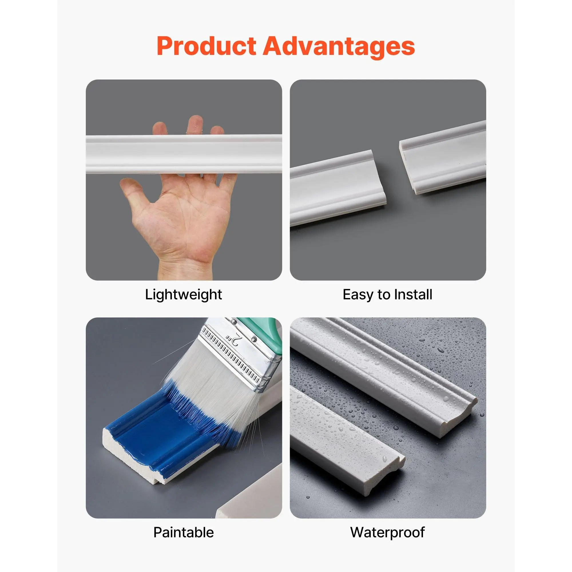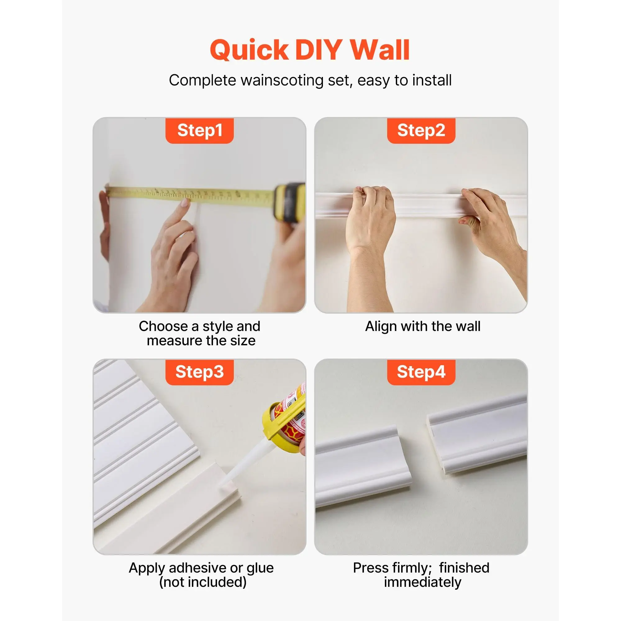 Modern Design for Any Space: This wall molding features clean modern lines that elevate any room with a refined look.Use it as wainscoting panels to create a visual focal point or as accent wall panels to highlight décor and upgrade your interior styleLightweight Premium Construction: Made from sturdy polystyrene, this wall trim is lightweight yet long-lasting.The molding trim resists damp, warping, and cracking, ensuring stable alignment and reliable indoor performance for years to comePre-Cut for Easy Installation: Each piece of molding trim is machine-cut with precise angles, allowing you to install without cutting or measuring.Apply with adhesive for fast, mess-free setup, ideal for renters needing removable accent wall panelsDIY-Ready Paintable Surface: These wainscoting panels feature a smooth, paintable surface for limitless creativity.Customize your wall trim with paint, decals, or décor.Waterproof testing ensures adhesion stays strong even after painting, long-term useVersatile for Multiple Rooms: This molding trim works with 10+ interior styles, from modern to classic.Use it as wall molding or accent wall panels in living rooms, bedrooms, hallways, or bathrooms to transform plain walls into stylish, elevated spacesVEVOR Wall Molding Kit, Wainscoting Panels, Lightweight Paintable Polystyrene, Easy to Install, Wide & Narrow Accent Wall Trim for Interior Décor Living Room, Bedroom, White (77.5 x 38.6 in )