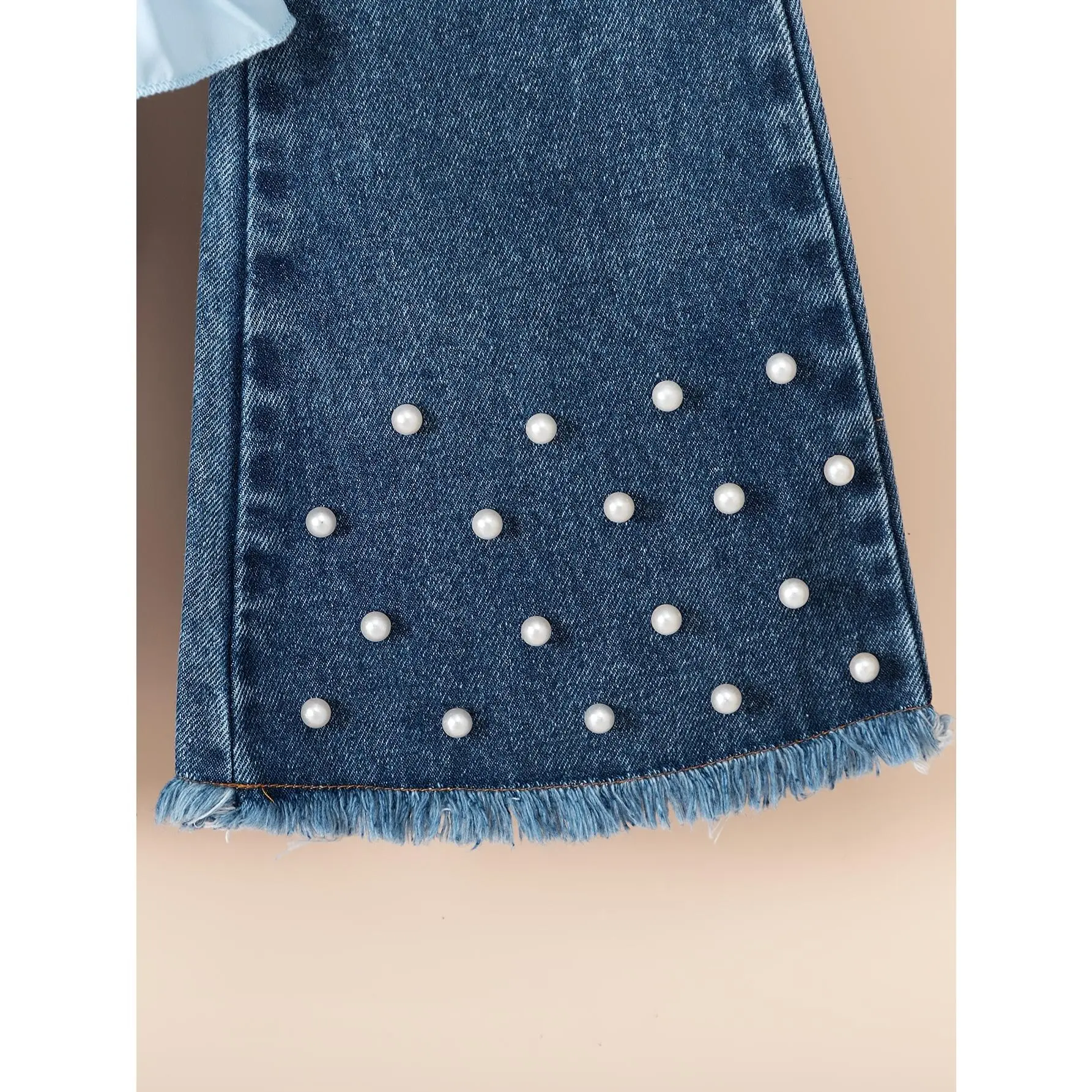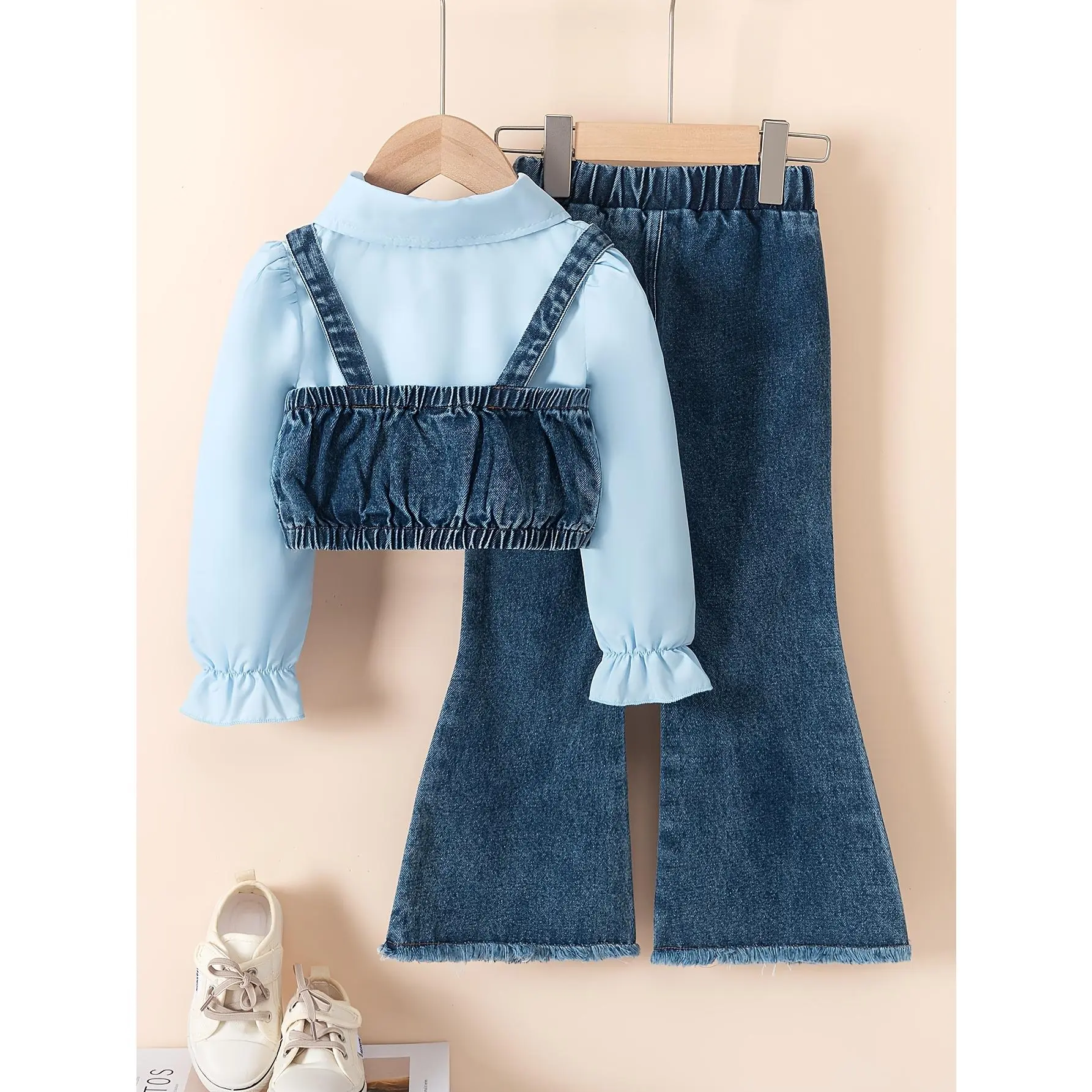 (New)3pcs Set for Girls: Solid-Color Long Sleeve Shirt, Denim Vest, Bead-Decorated Flared Bell-Bottom Jeans | Casual Daily Wear, Non-Stretch Fabric, Regular Fit, for Outdoor(Gift)11