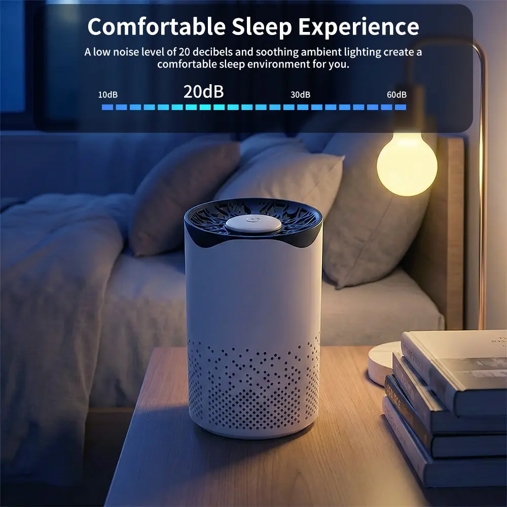 Material: ABS Power: 5W Voltage: 5V Product Dimensions: 11.8*11.8*18cm Filter Element Dimensions: 9.5*10CM Power Supply: DC5V/USB Port Color: White Control method: Touch screen Working principle: Ultraviolet light, HEPA technology Installation method: No installation required