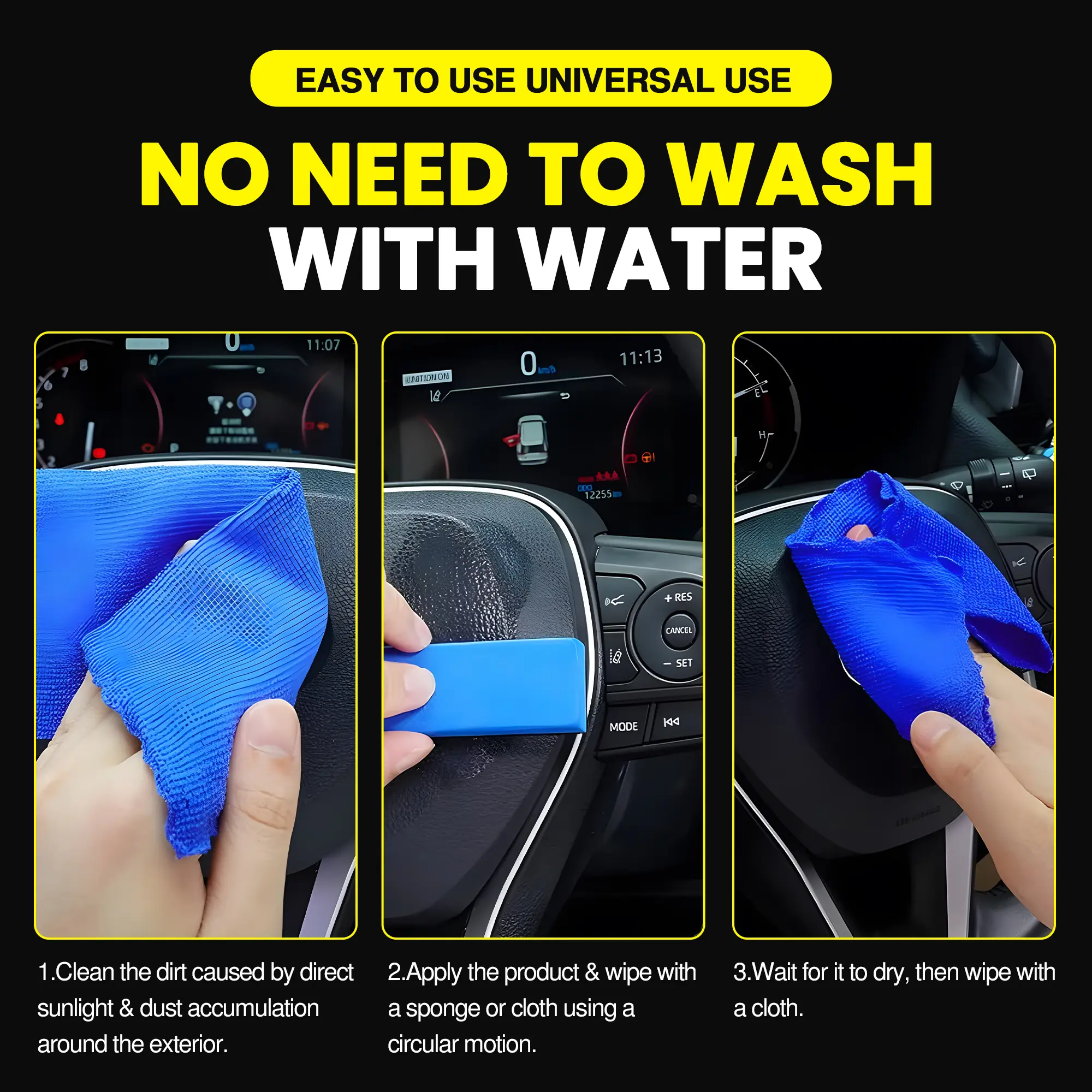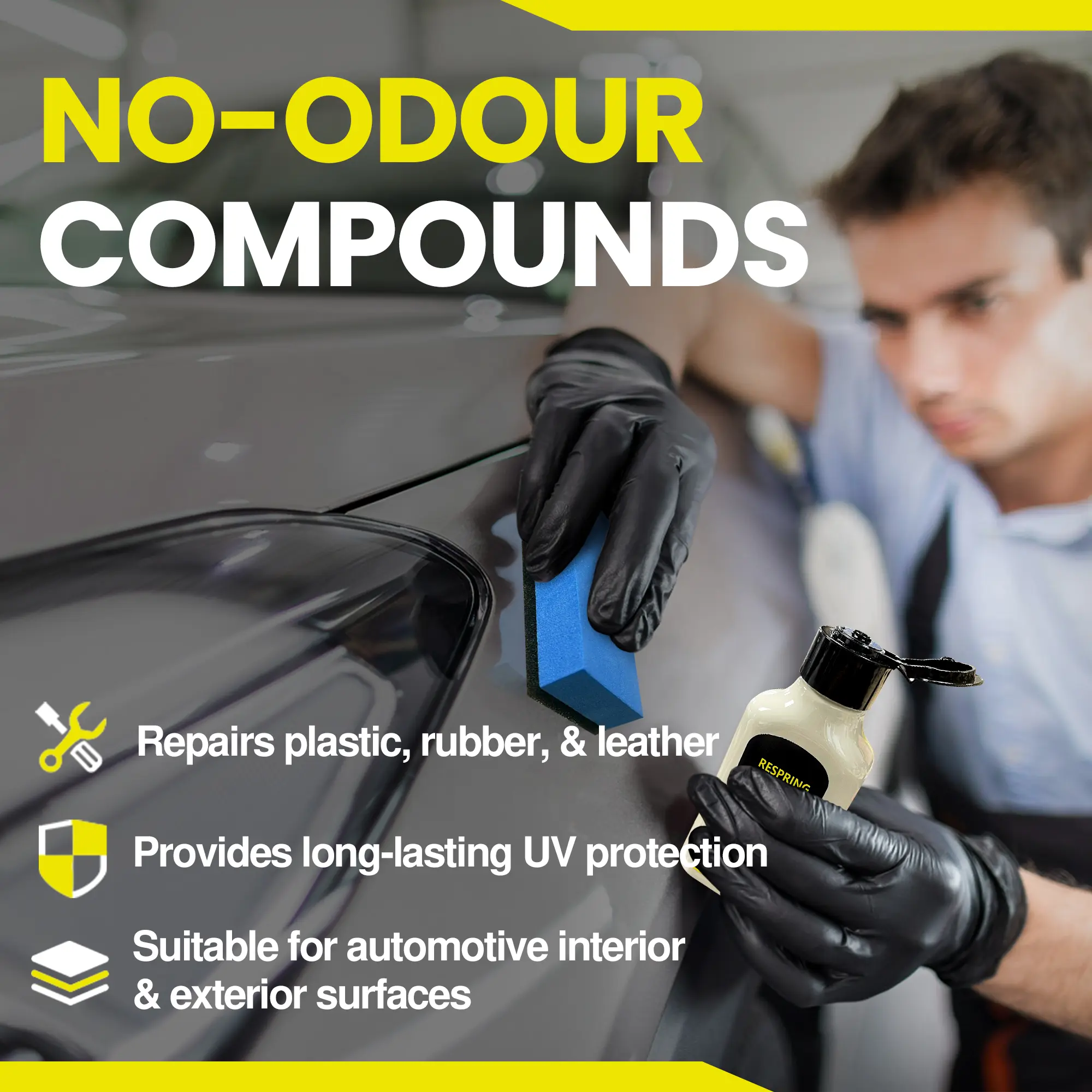 Simply apply the restorer to the desired areas. It's straightforward and hassle-free, ensuring you can restore your car's plastic parts effortlessly. No need for professional help. 🛠️