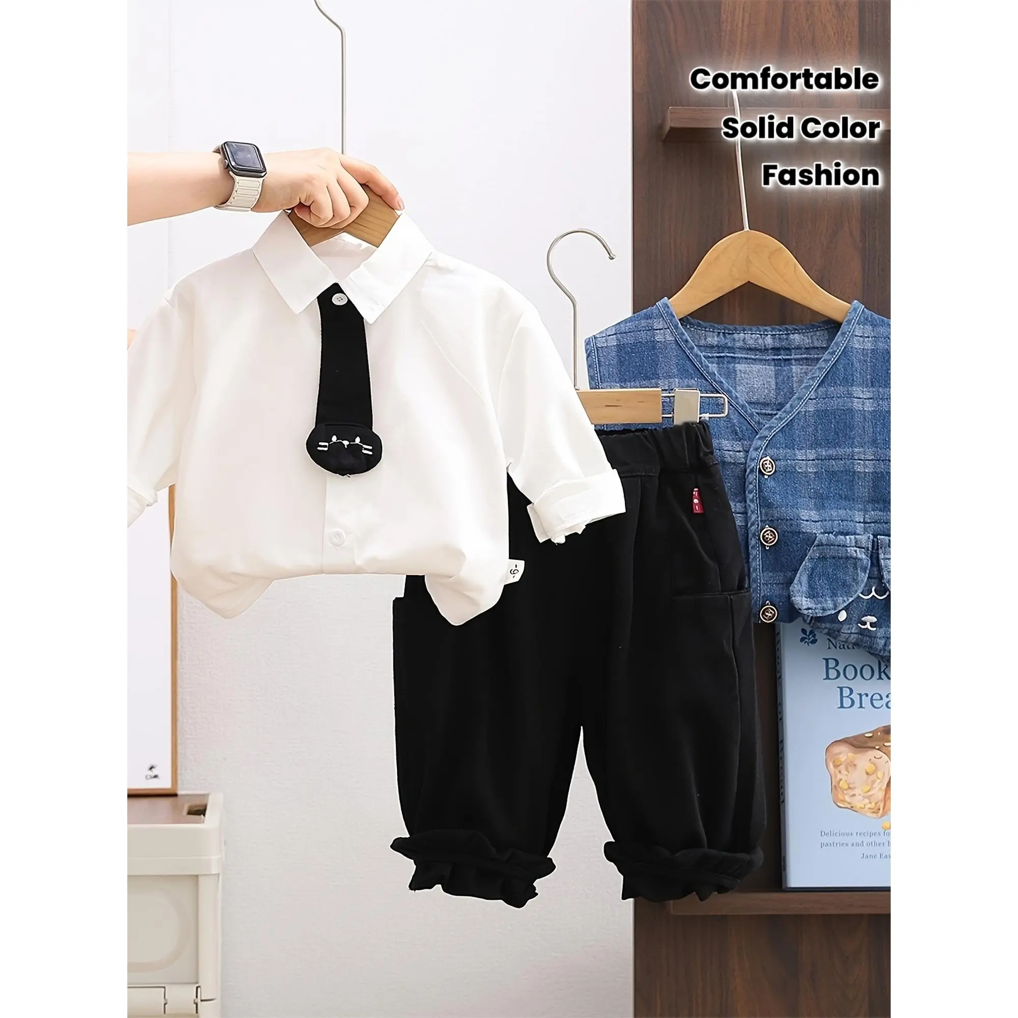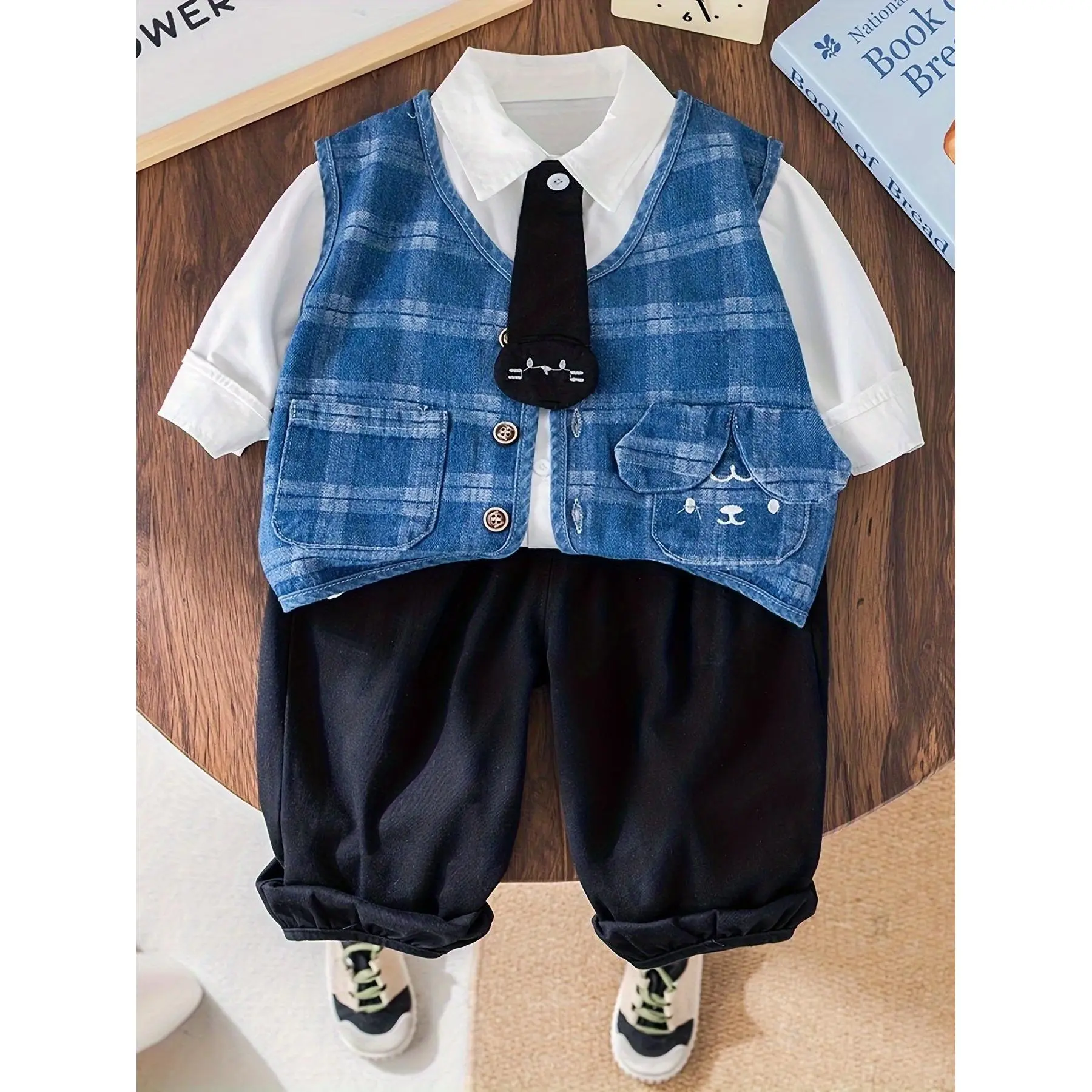 (New)Boys' Spring/Autumn Plaid Denim Vest 3pcs Set!Solid Color Shirt Comfortable Fit Light Boys Casual Outfit, for Outdoor(Gift)11