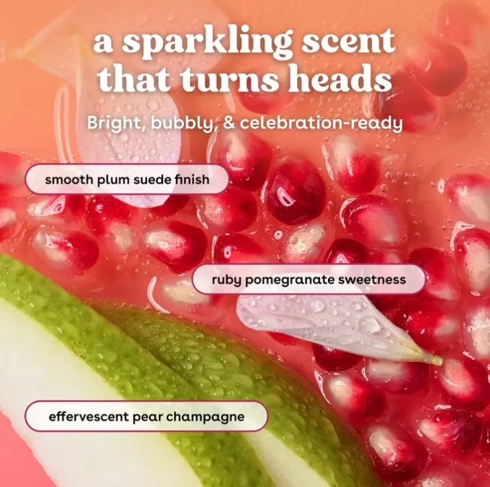 ·PINK CHAMPAGNE: Features notes of pear champagne, ruby pomegranate & plum suede.