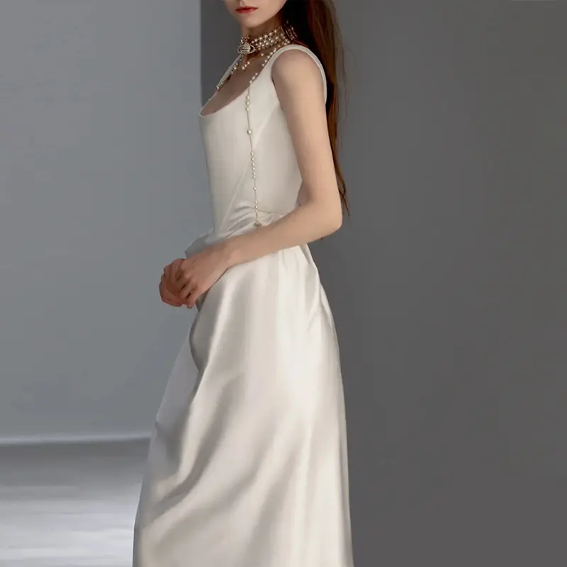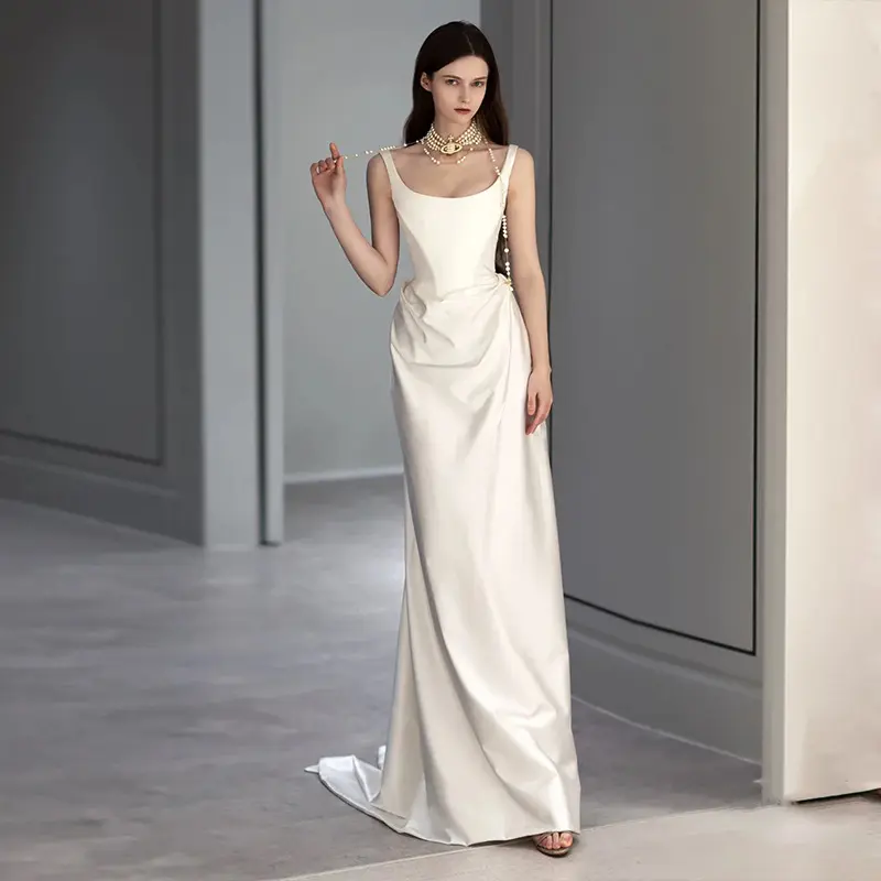 Satin Light Wedding Dress 2026 – Vintage Simple Spaghetti Strap Departure Gown, Small Train Bridal Evening Dress