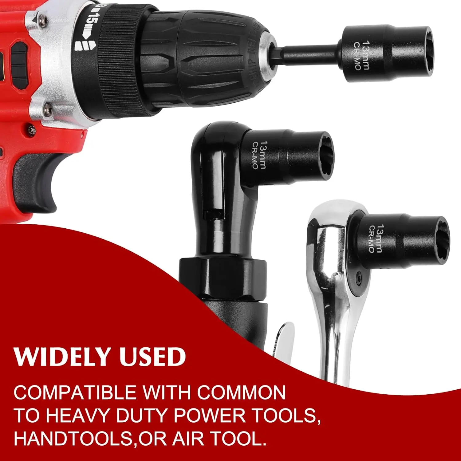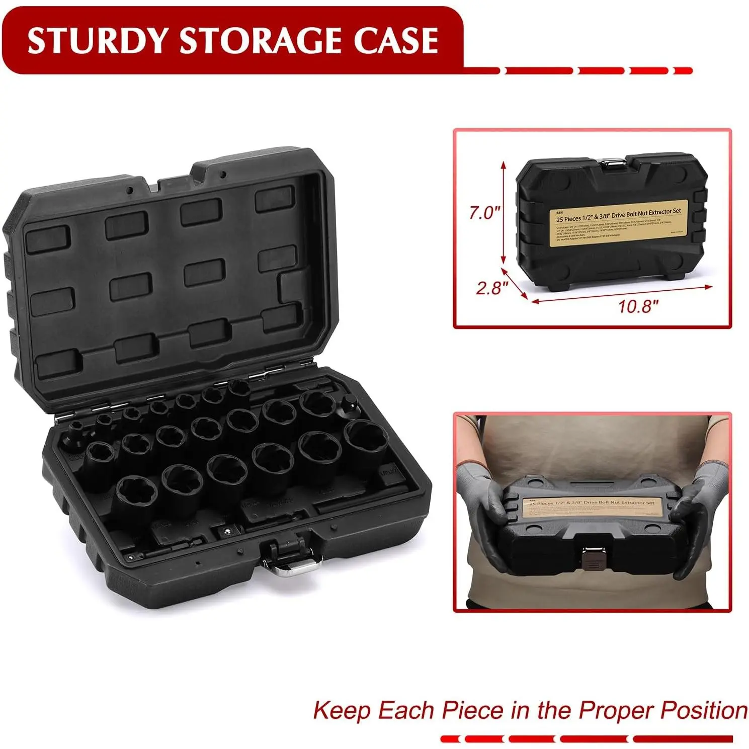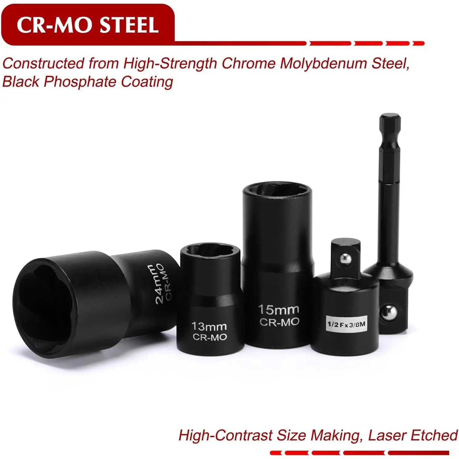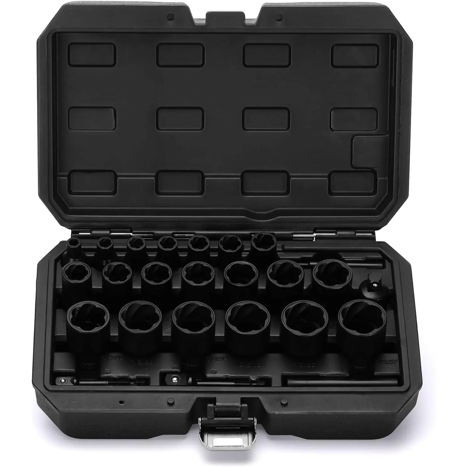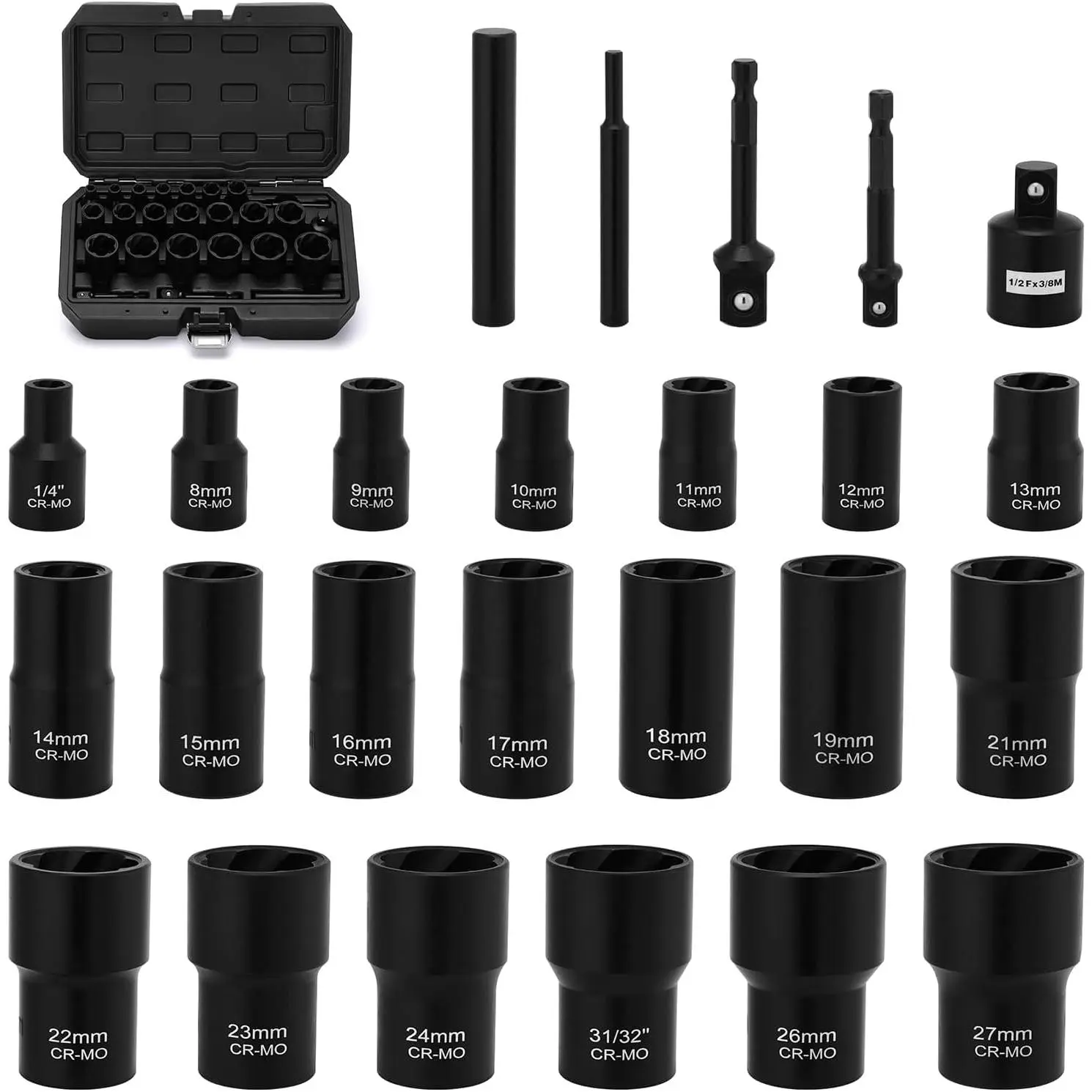 The 25 pieces bolt nut extractor set is constructed from high-strength chrome molybdenum steel, with a protective black phosphate coating.Set Includes: 3/8'' Dr: 1/2"(13mm), 15/32"(12mm), 7/16"(11mm), 3/8"(10mm), 11/32"(9mm), 5/16"(8mm), 1/4".1/2'' Dr: 1-5/64"(27mm), 1-3/64"(26mm), 31/32", 61/64"(24mm), 29/32"(23mm), 7/8"(22mm), 53/64"(21mm), 3/4"(19mm), 23/32"(18mm), 11/16"(17mm), 5/8"(16mm), 19/32"(15mm), 9/16"(14mm).Accessories: 2 solid iron bars3/8" Hex Drill Adapter,1/2" Hex Drill Adapter,1/"2F-3/8"M AdapterNut Extractor Set Features: Removing stuck itemsRemoving stripped/rusted, or damaged nutsRemoving the locknuts.There are high contrast and specific size marking for identification.It comes with a sturdy and convenient storage case, which keeps each piece in the proper position.All EMENTOL products meet or exceed ANSI and DIN performance standards.