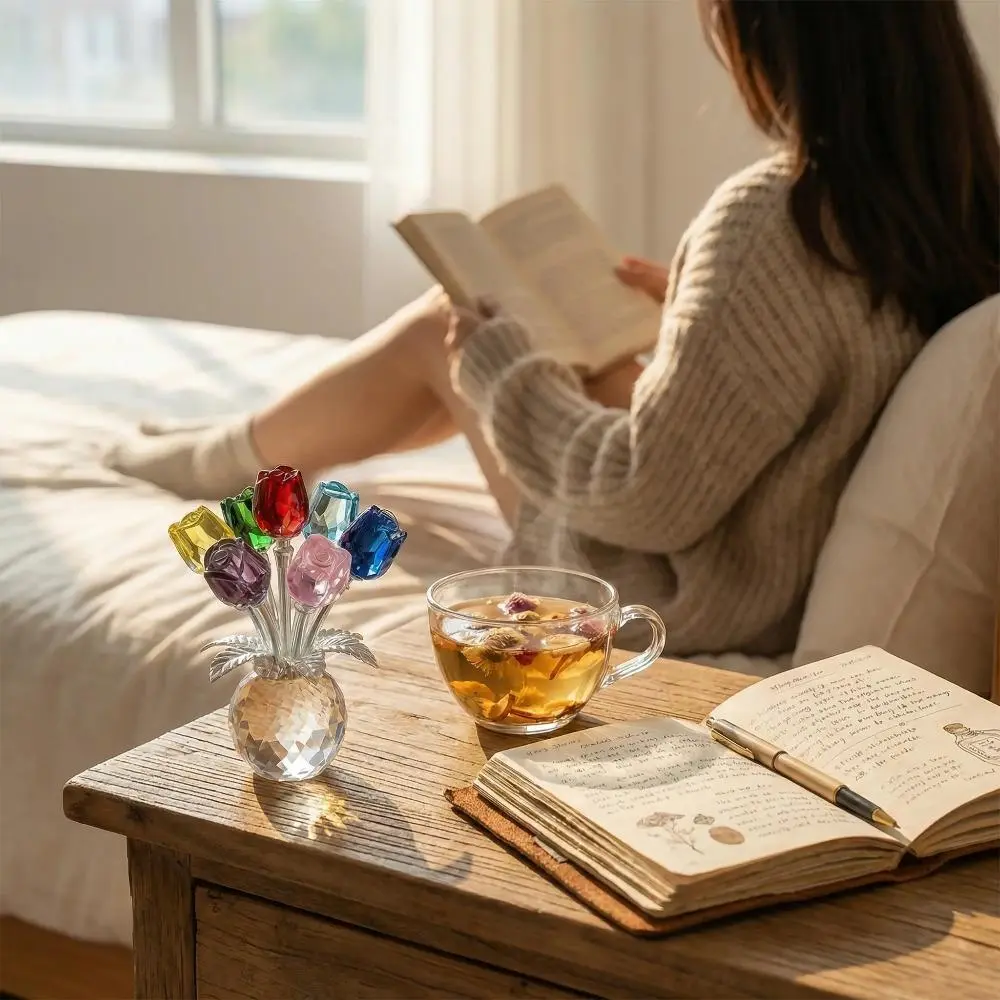 Colorful Rose Flower Crystal Figurine with Vase Bouquet, Handmade K9 Crystal Ornament for Home Table Decor, Ideal Valentine's Day, Wedding & Anniversary Gift for Wife, Girlfriend & Women