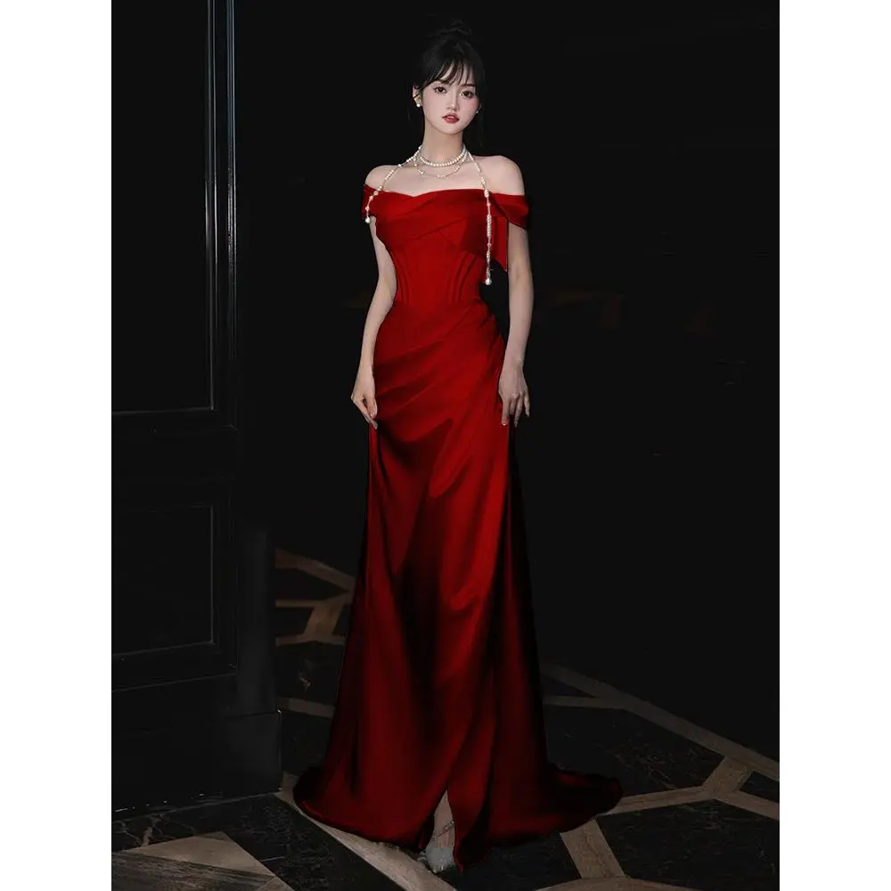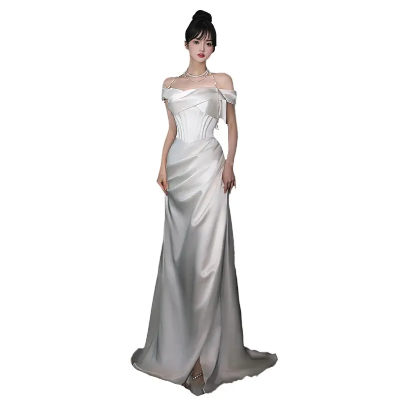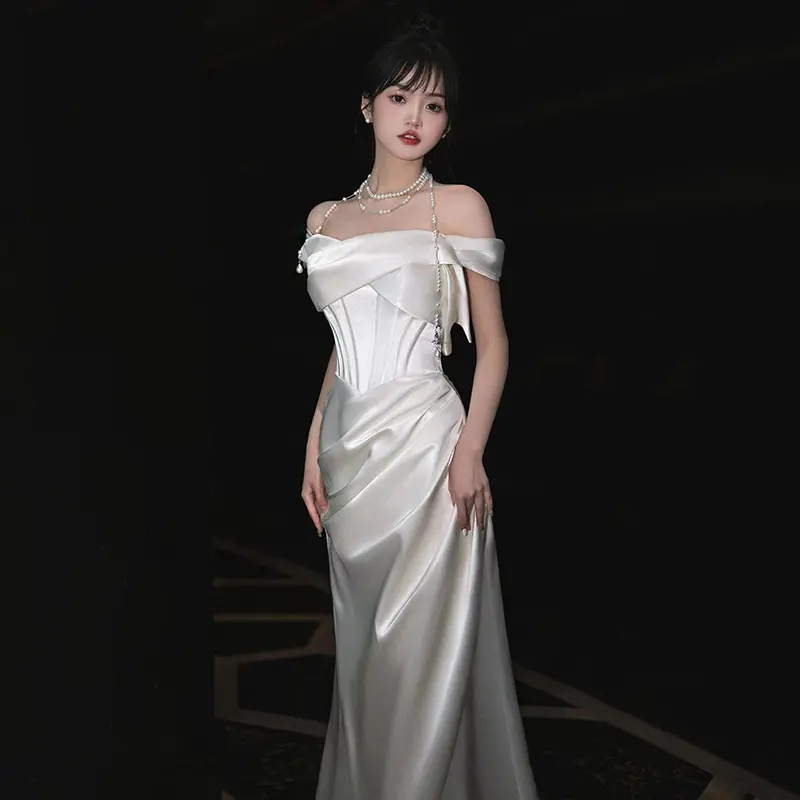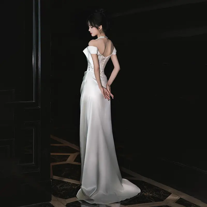 French Off-Shoulder Light Wedding Dress – Bridal Toast Gown, White Engagement Departure Dress, Elegant Banquet Evening Gown
