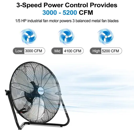 ·Powerful 5200 CFM High-Velocity Airflow – 3 speed settings deliver 5200 CFM (High) / 4100 CFM (Medium) / 3000 CFM (Low) for fast and effective cooling of large spaces