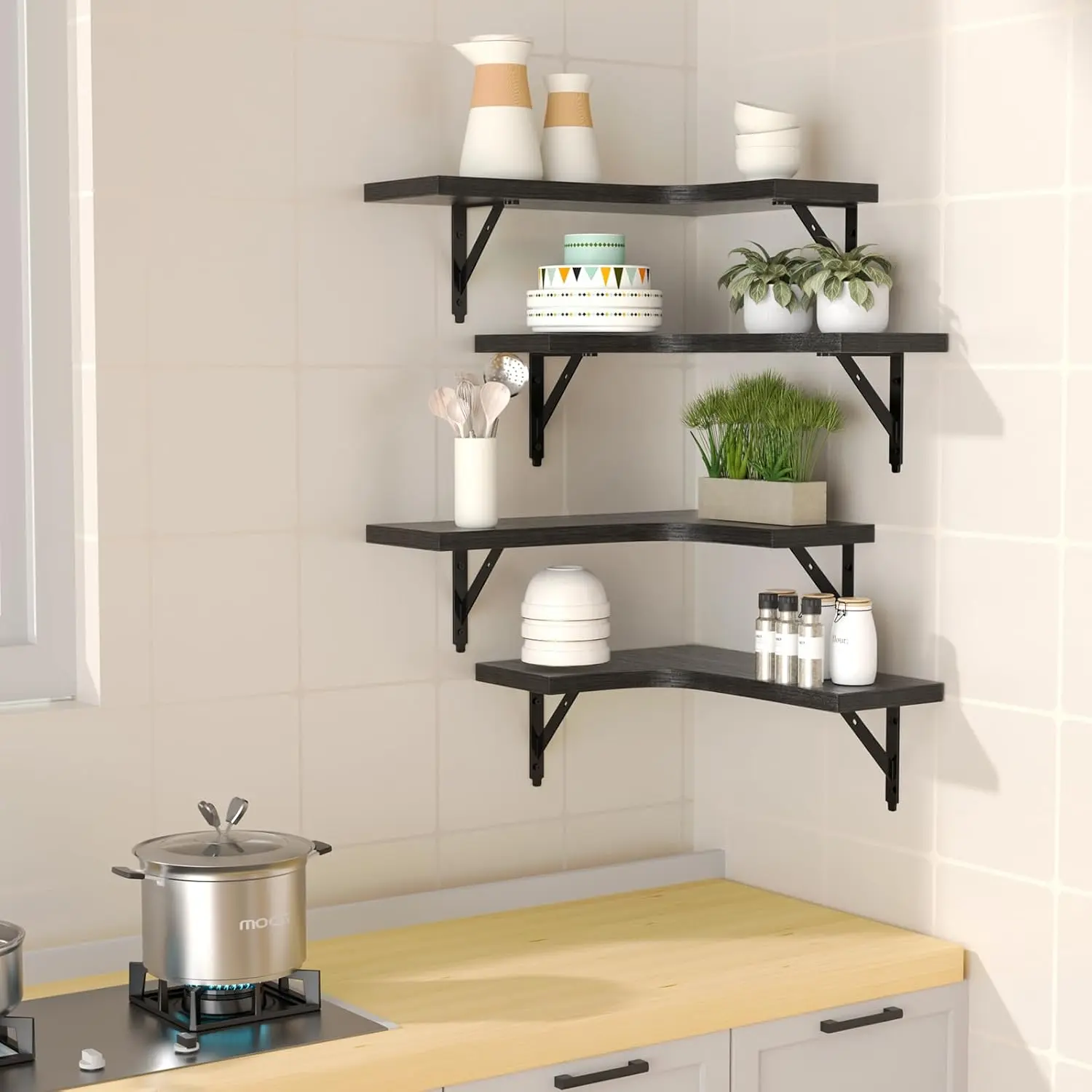 ✨ CRAFT Corner Floating Shelves bring a rustic charm to any room. This set of 4 wall-mounted shelves is perfect for home decor, bathrooms, kitchens, bedrooms, living rooms, and offices. Crafted in a sleek black finish, these shelves add a modern touch to your interior. Ideal for storage and display, they maximize space without clutter.