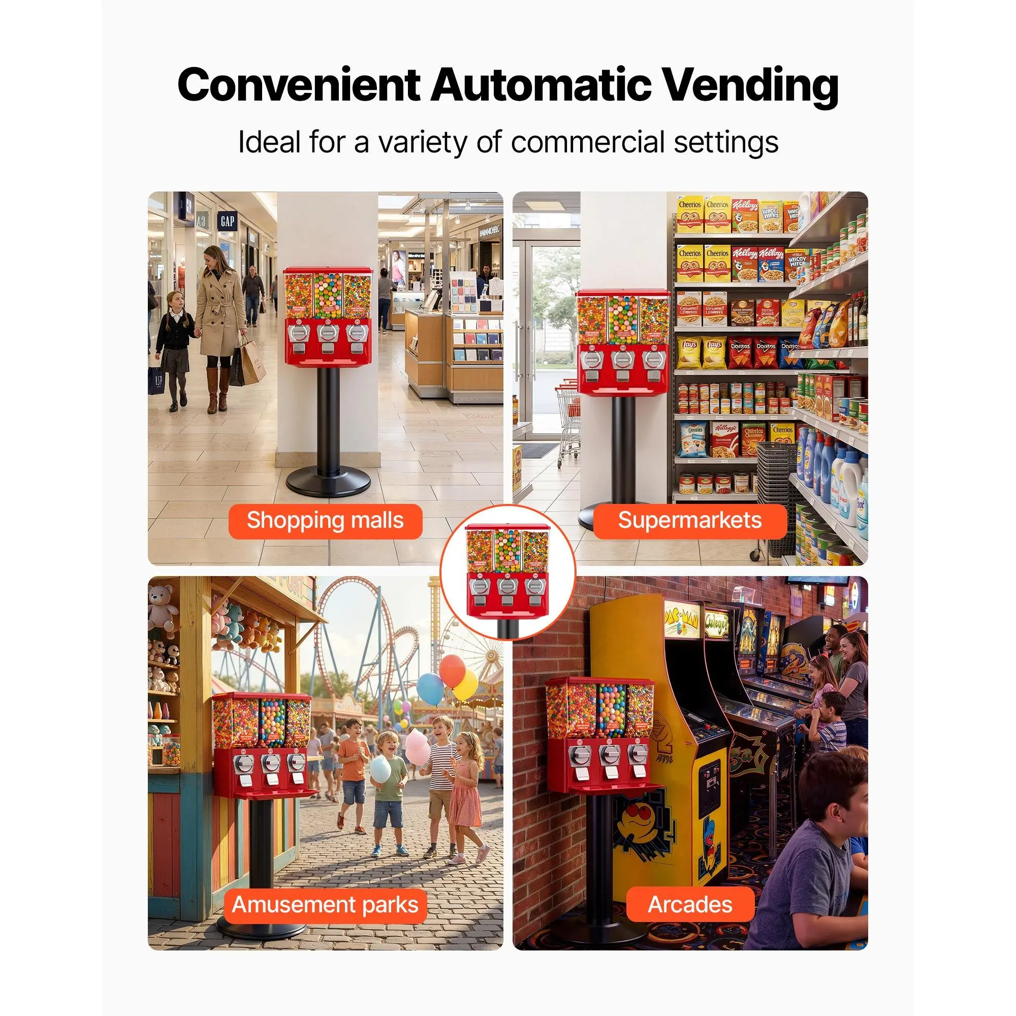 High Capacity Setup: Equipped with three separate clear bins, our gumball & candy vending machine features two adjustable bulk candy wheels and one round wheel for 0.9-1.3 inch/22.86-33.02mm capsules.Each bin holds 8 lbs/3.63 kg and can store up to 320 pieces of 1 inch/25.4mm gumballs, bounce balls, or capsule toysSolid Construction Design: Built with a transparent PS jar, this coin operated vending machine allows clear product display and simple cleaning.The structure includes an aluminum alloy base and front panel paired with an iron top.Inside, a zinc alloy coin mechanism supports stable operation and reduces issues during useSimple Coin Control: This VEVOR gumball vending machine uses a manual coin-operated design and requires no electricity.Insert one 25-cent coin, then rotate the control handle 360 degrees clockwise to release a mini capsule toy at the outlet.The process is simple, engaging, and quick for everyday useLocking Security Design: Designed with a keyed locking lid, our gumball machine stand limits access to capsule toys and stored coins.Only the matching key can open the top.The capsule exit includes a metal baffle that slows item movement and helps avoid items falling straight onto the groundMultiple Applications: Our vintage candy dispenser is suitable for selling small capsule toys and rubber ball toys, making it a good fit for game shops, retail stores, and amusement parks.It can also be placed at home or used during parties, creating fun and interactive moments for parents and children togetherVEVOR Candy Vending Machine, Triple Compartment Candy Vending Machine with Stand, Gumball & Candies Vendings Machines with Built-In Cash Box, Detachable, Vintage Candies Dispenser for Shops, Arcades