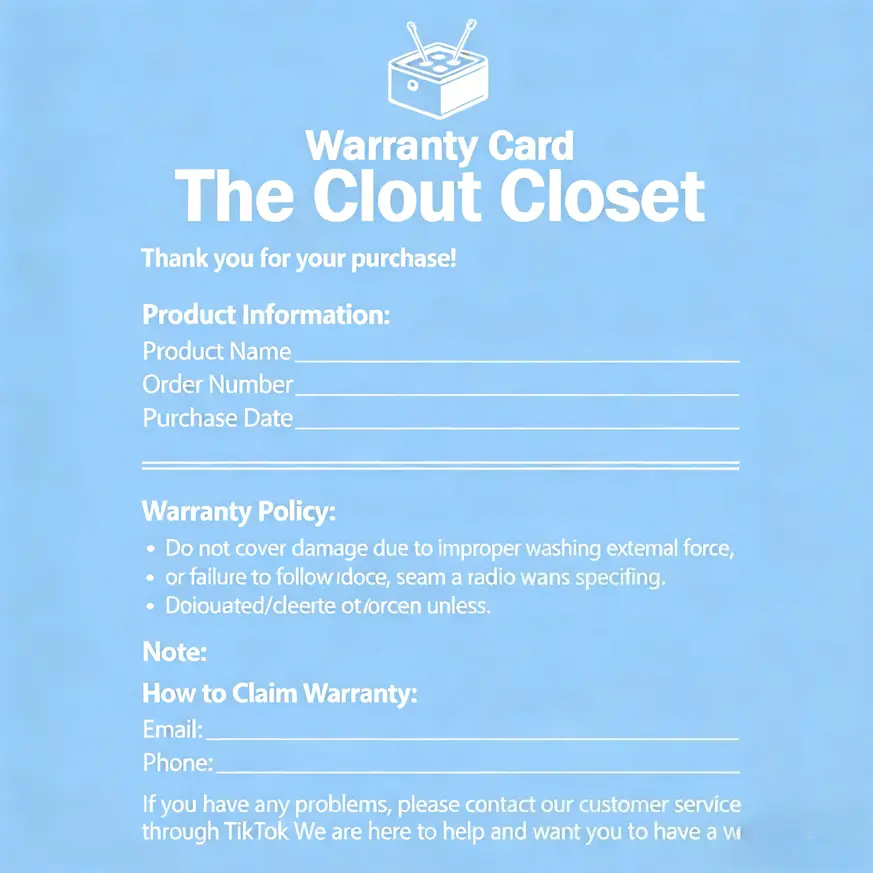This certificate is an exclusive guarantee for The Clout Closet trendy T‑shirt.It provides you with a fashionable, high‑quality T‑shirt supported by official after-sales protection.