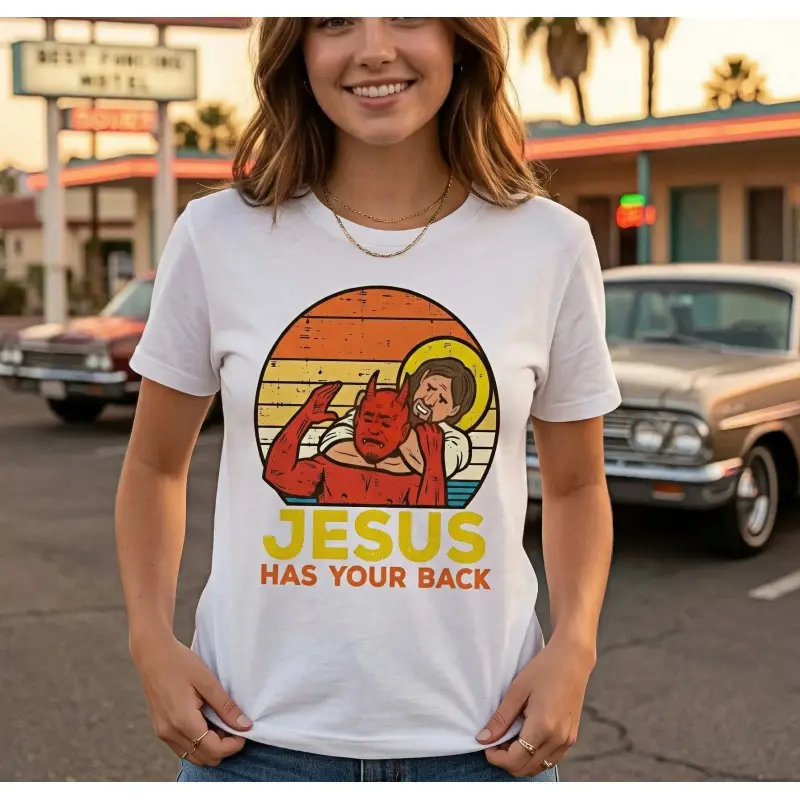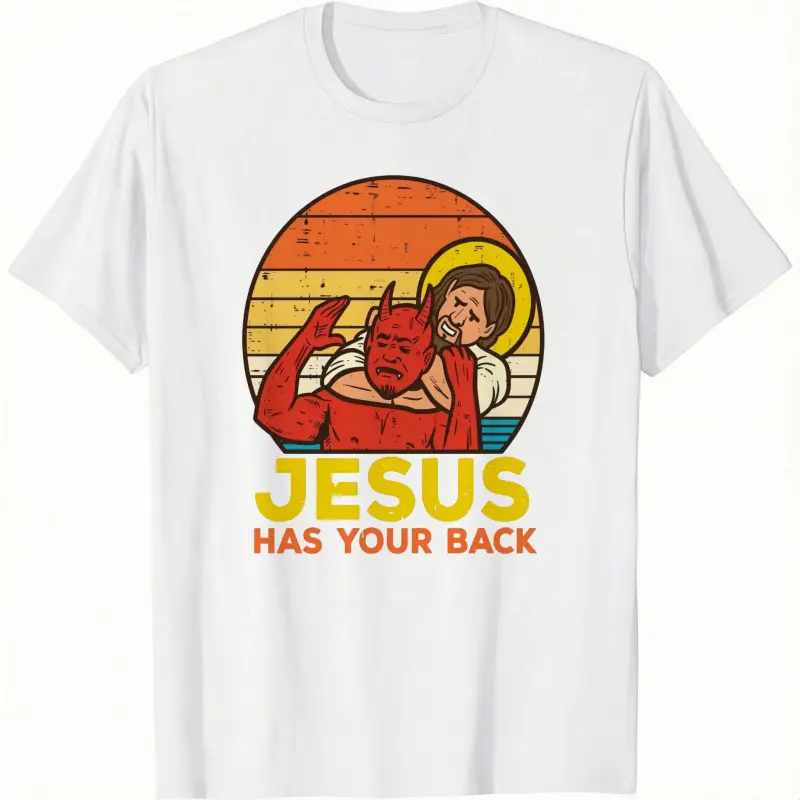 Cotton Jesus Has Your Back Jiu Jitsu Retro Christian Men Women Kids T-Shirt.This t-shirt features a retro Christian theme with the phrase "Jesus Has Your Back" and "Jiu Jitsu."The design is suitable for all genders and age groups.The retro Christian motif includes a Jiu Jitsu element.The text "Jesus Has Your Back" is prominently displayed.