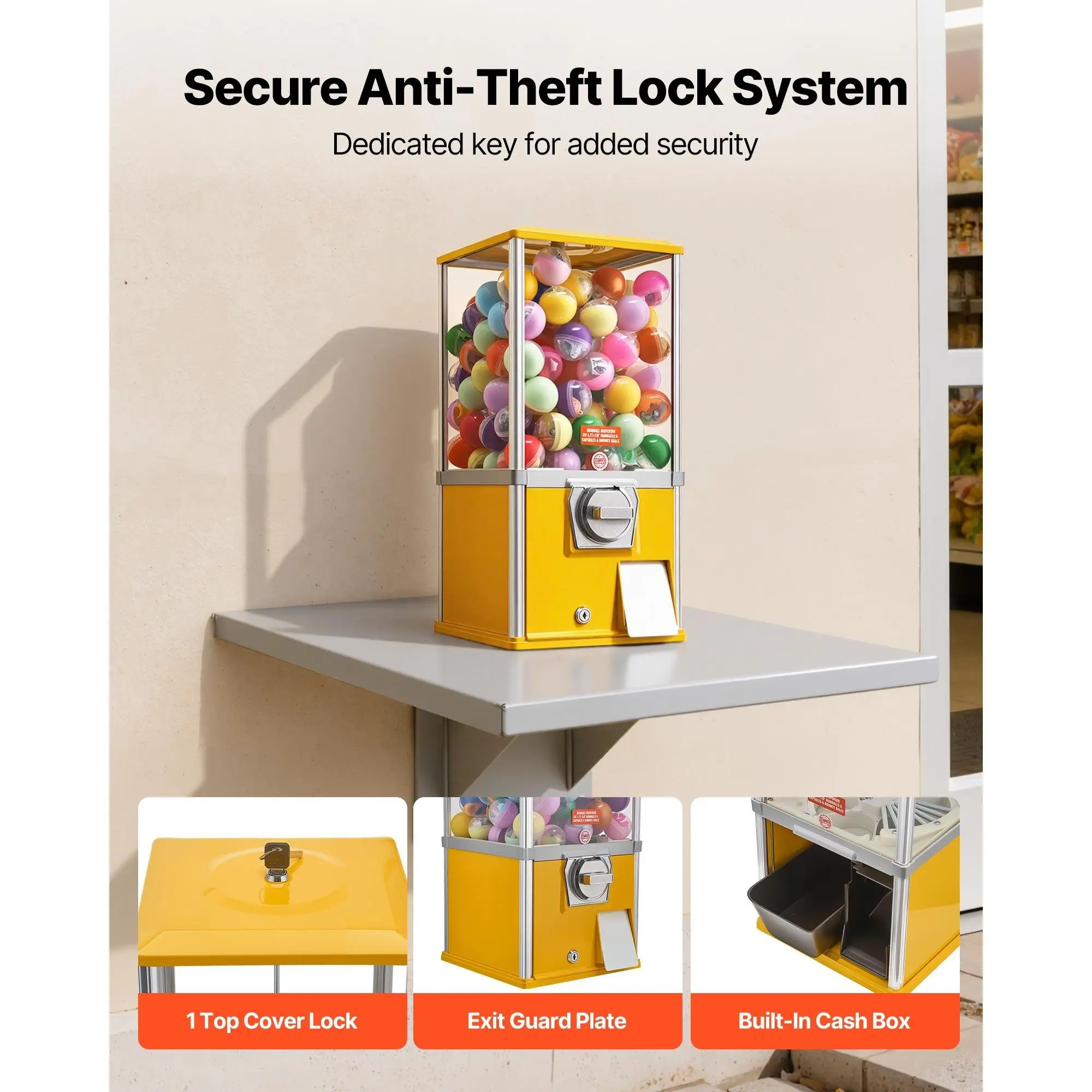 Large Clear Storage: This gum ball machine features a 21-inch/533.4mm transparent globe that holds up to 180 spherical items sized 1.77-2 inch/44.96-50.8mm.An adjustable rotating feeder at the inlet adapts to different sizes, allowing smooth automated vending of gumballs, mini capsule toys, and rubber ball toysSolid Material Build: Featuring a transparent PS jar, our commercial vending machine shows contents clearly and supports quick cleaning.The structure includes an aluminum alloy base and front panel with an iron top.The zinc alloy coin mechanism reduces coin jams, and the solid build handles occasional drops during useSimple Coin Control: This candy gumball vending machine features a classic coin-based system that runs without electricity.After inserting one 25-cent coin, users rotate the control lever clockwise through a full circle to collect a mini capsule toy from the outlet.The operation is quick, entertaining, and easyLocking Top Design: This VEVOR candy machine dispenser features a locking top cover that opens only with the key, keeping capsule toys and coins secured from unauthorized access.A metal baffle at the capsule outlet helps slow item release, reducing impact and keeping items from dropping directly onto the floorMultiple Applications: Suitable for dispensing mini capsule toys and rubber ball toys, our gumball machine maker fits well in arcades, retail spaces, and amusement areas.For families, it can also be used at home or during parties, creating enjoyable shared experiences with childrenVEVOR Gumball Machine, 21 inch Height Candy Vending Machine Dispenser, 25-Cent Vending Machines for Shopping Malls, Supermarkets, Amusement Parks, Arcades, Holds Up to 180 1.77 inch Spherical Candies