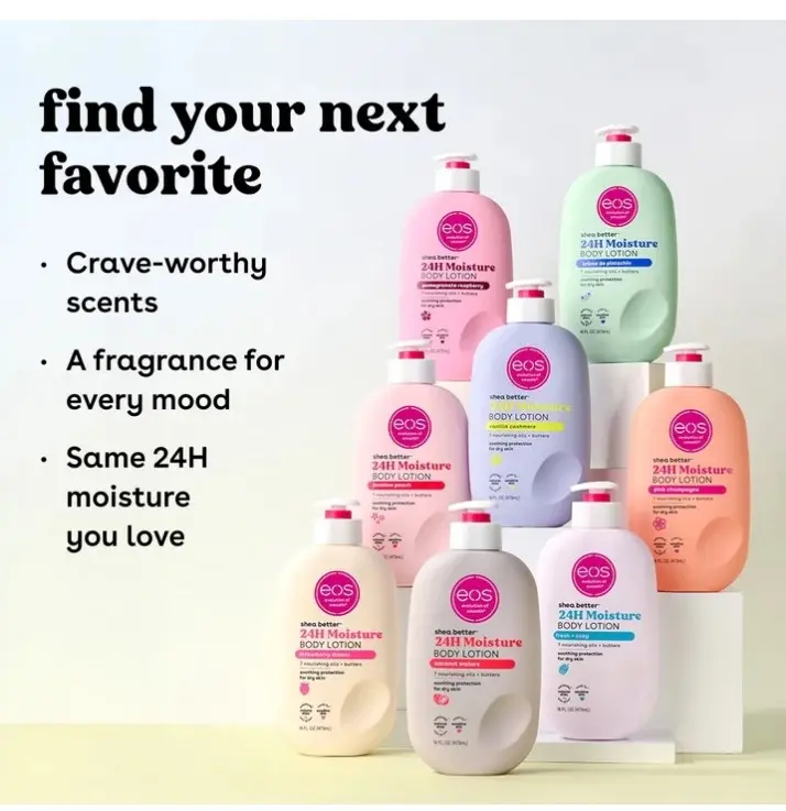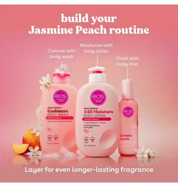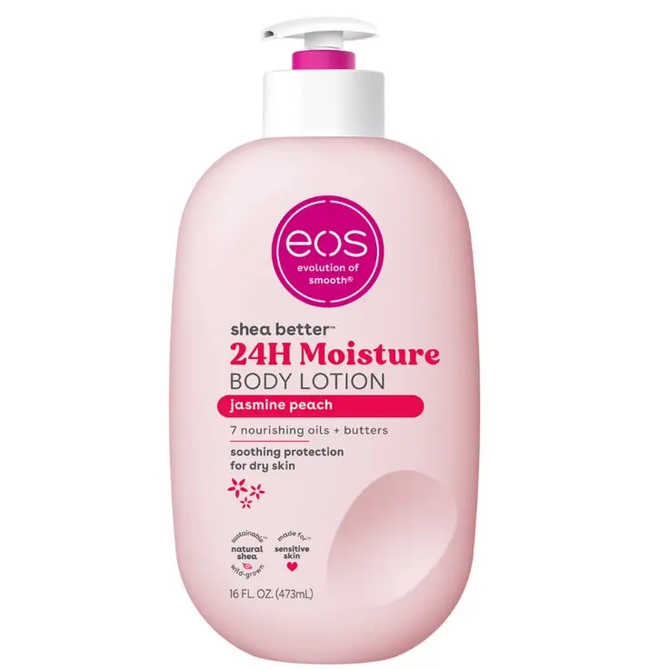 ·SHEA BETTER BODY LOTION: Our sparkling and luscious Jasmine Peach scent contains fragrance notes of apricot nectar, sparkling jasmine, and vanilla sugar. eos 24-hour hydration body lotion is made with natural ingredients to leave your skin smooth from head-to-toe.