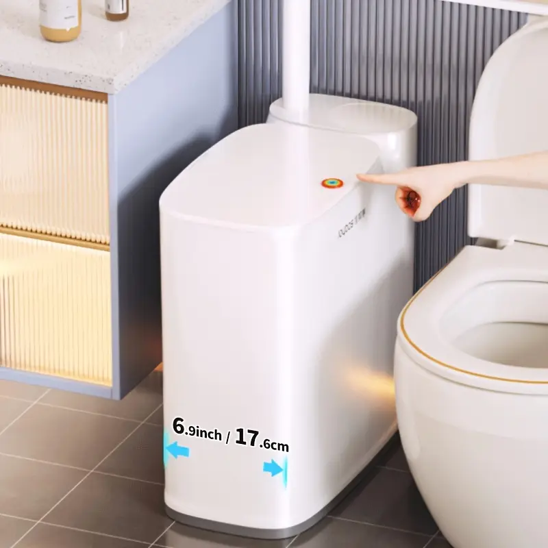 This product serves a dual purpose: it functions as both a detachable waste bin for the bathroom and a holder for the toilet brush.Its compact design caters to the everyday requirements of smaller bathrooms, optimizing space.The slender trash can has a capacity of 7.7 liters (2.03 gallons) and is tailored for tight bathroom areas.