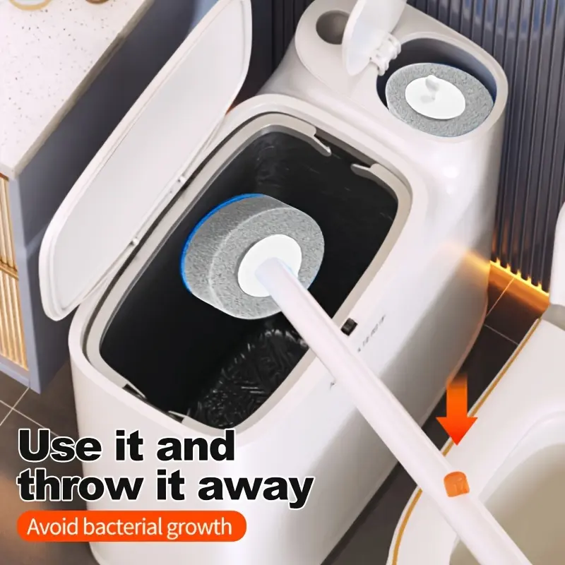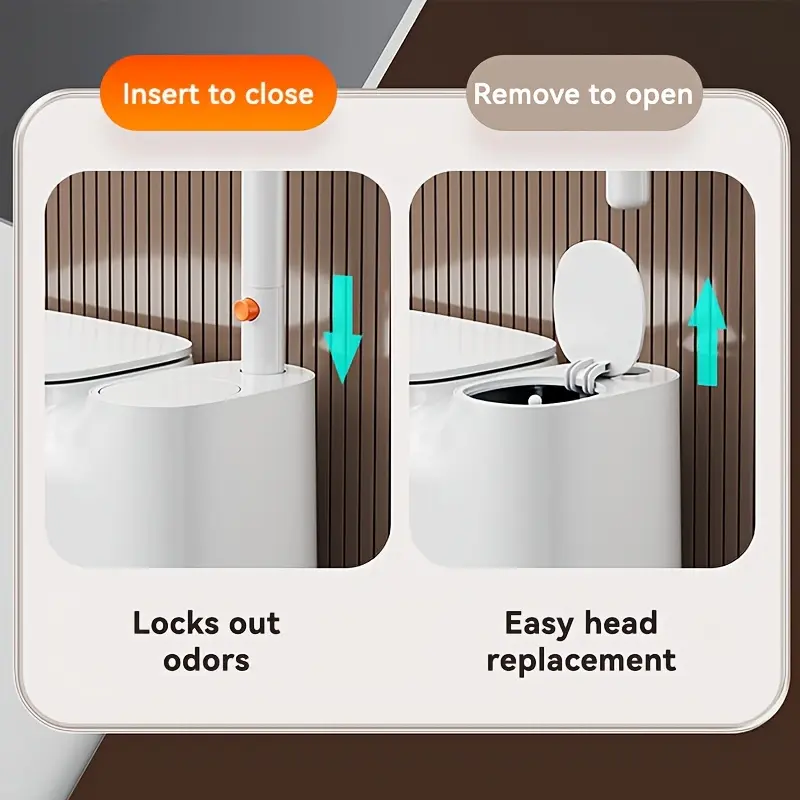 User-friendly: Take off the handle of the toilet brush, and the lid for storage will spring open by itself.Simply press the button on the handle, place the handle into the clip of the brush head, and dip it in water to clean the toilet.Once you're done, position the brush head over the waste bin and press the orange button to effortlessly remove the brush head.