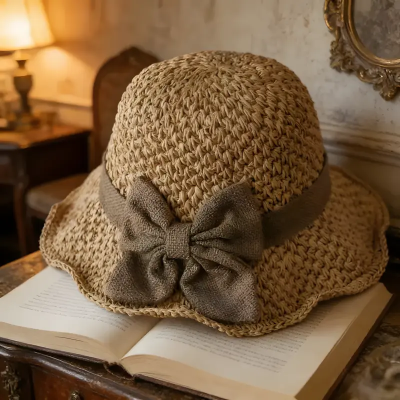 Vintage Handwoven Straw Hat with Ruffle Bow, Elegant French Sun Hat, Foldable Breathable Beach Hat for Travel & Outdoor Wear