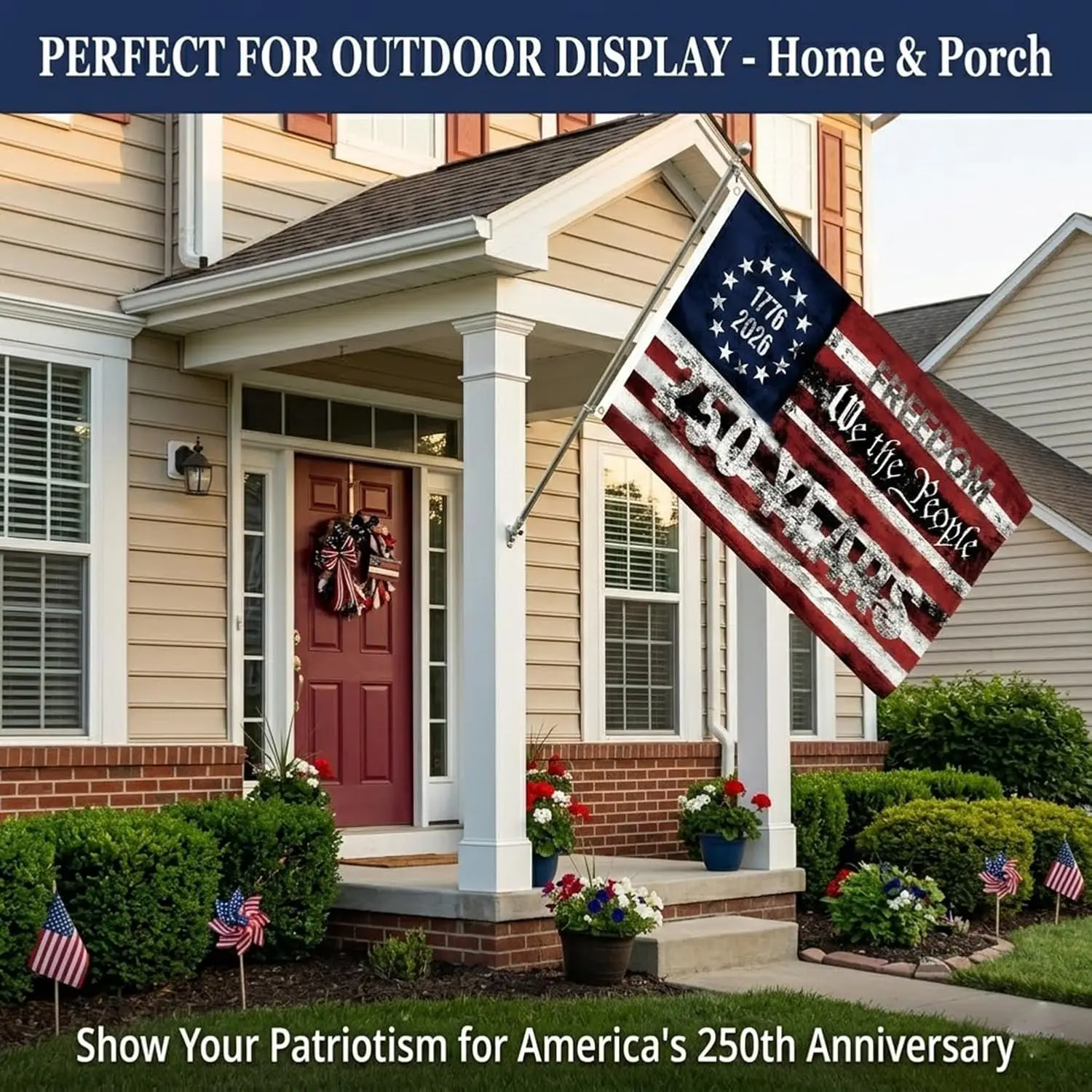 ·[Wide Application]: Easy to hang on front porches, fences, porches, walls, or flagpoles, offering a flexible 250 anniversary USA flag display for indoor or outdoor.