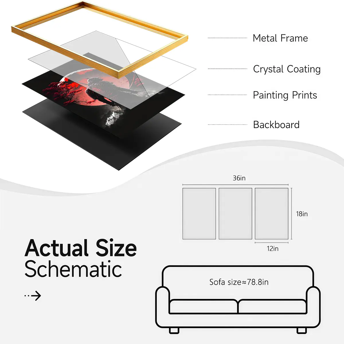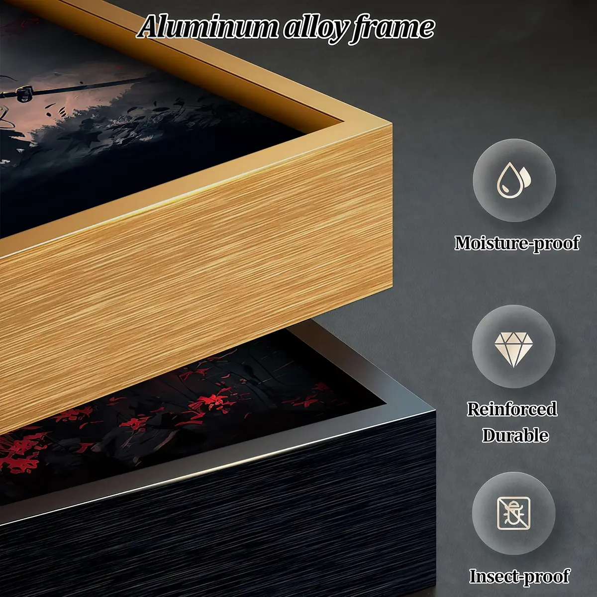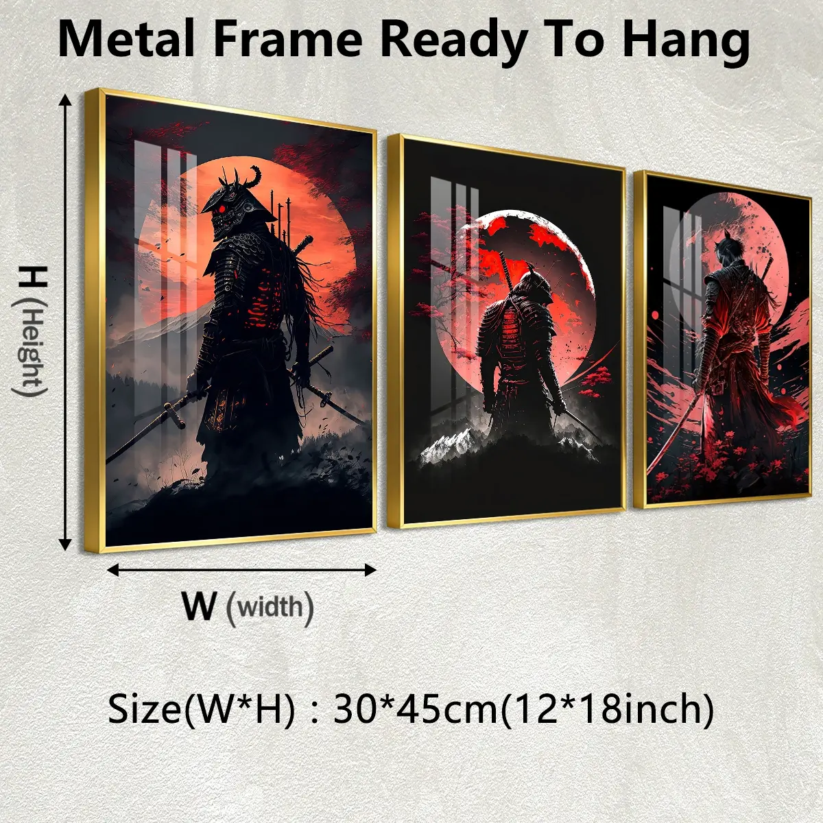 3 Counts Aluminum Alloy Framed Painting, Samurai Warriors Under Red Moon Artwork, Home Decoration For Living Room, Bedroom, Office, Restaurant, Hallway Wall Decor, Odorless Print Artwork, Luxury Perfect Gift For Friends And Family