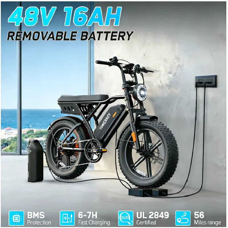 ·Long-Range: 48V 16Ah battery, 50–56 miles.