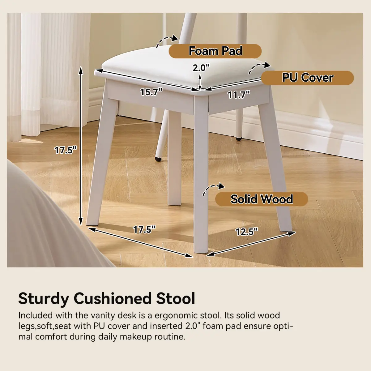Included with the vanity desk is a ergonomic stool. lts solid woodlegs,soft,seat with PU cover and inserted 2.0" foam pad ensure opti-mal comfort during daily makeup routine.