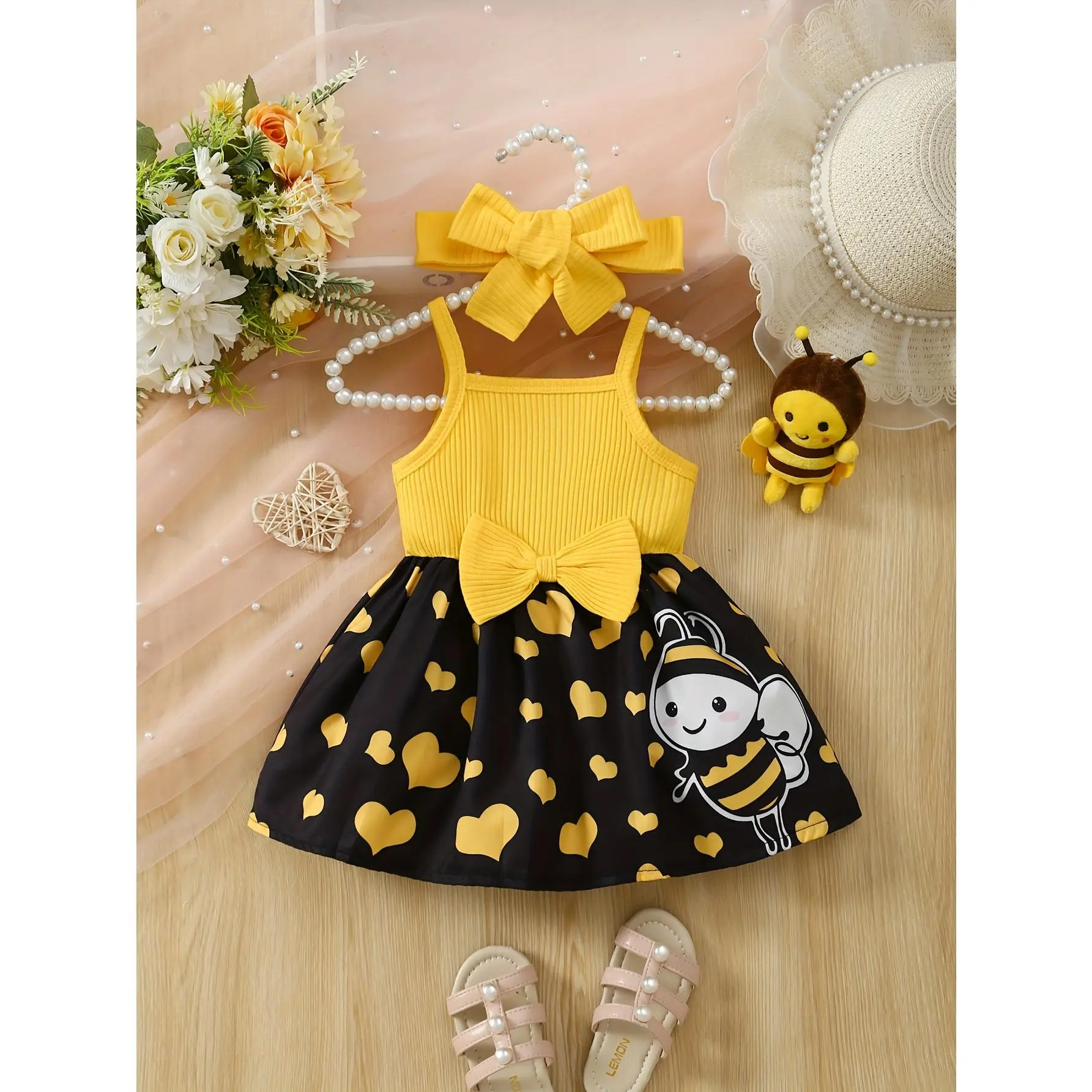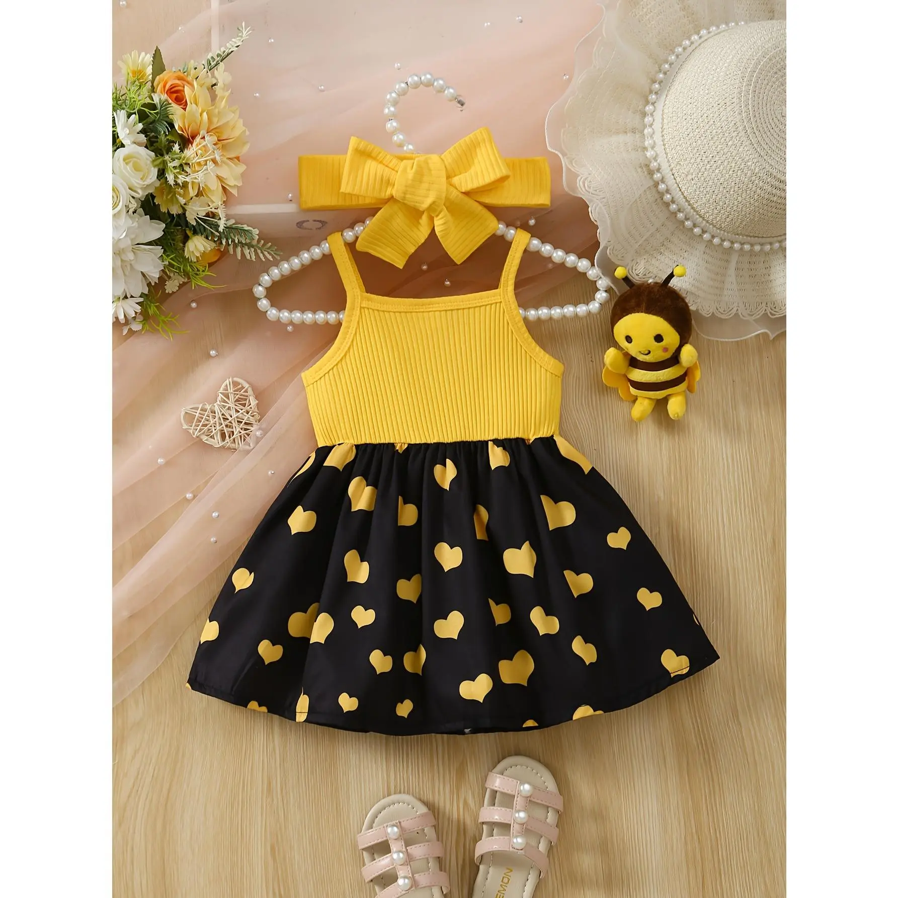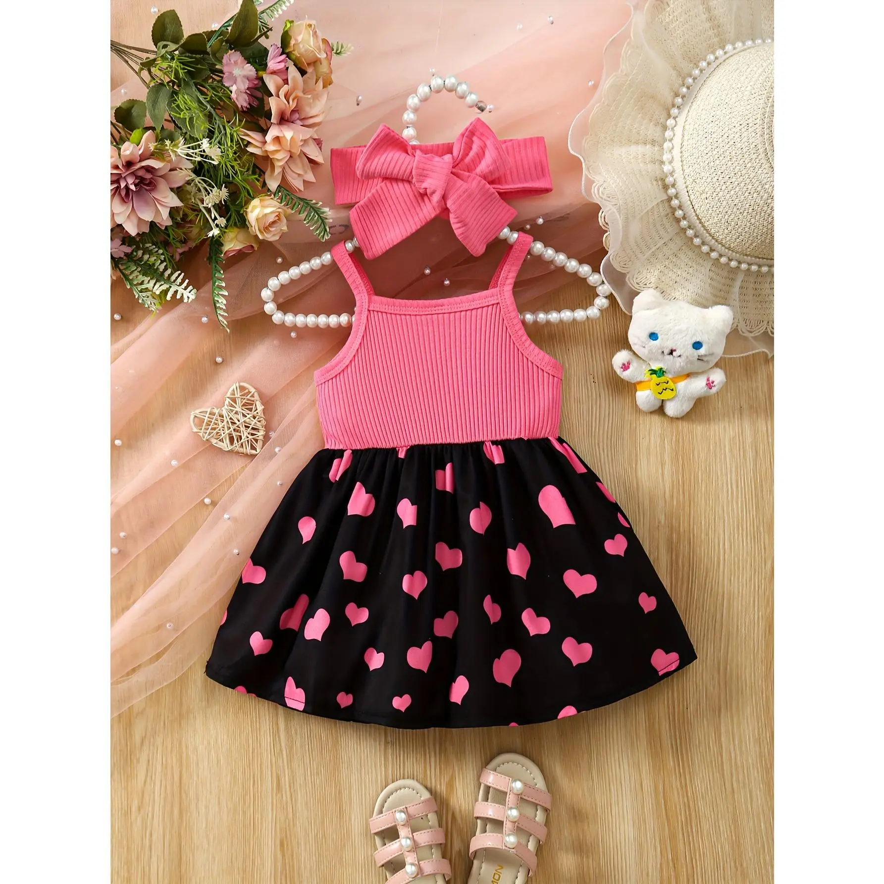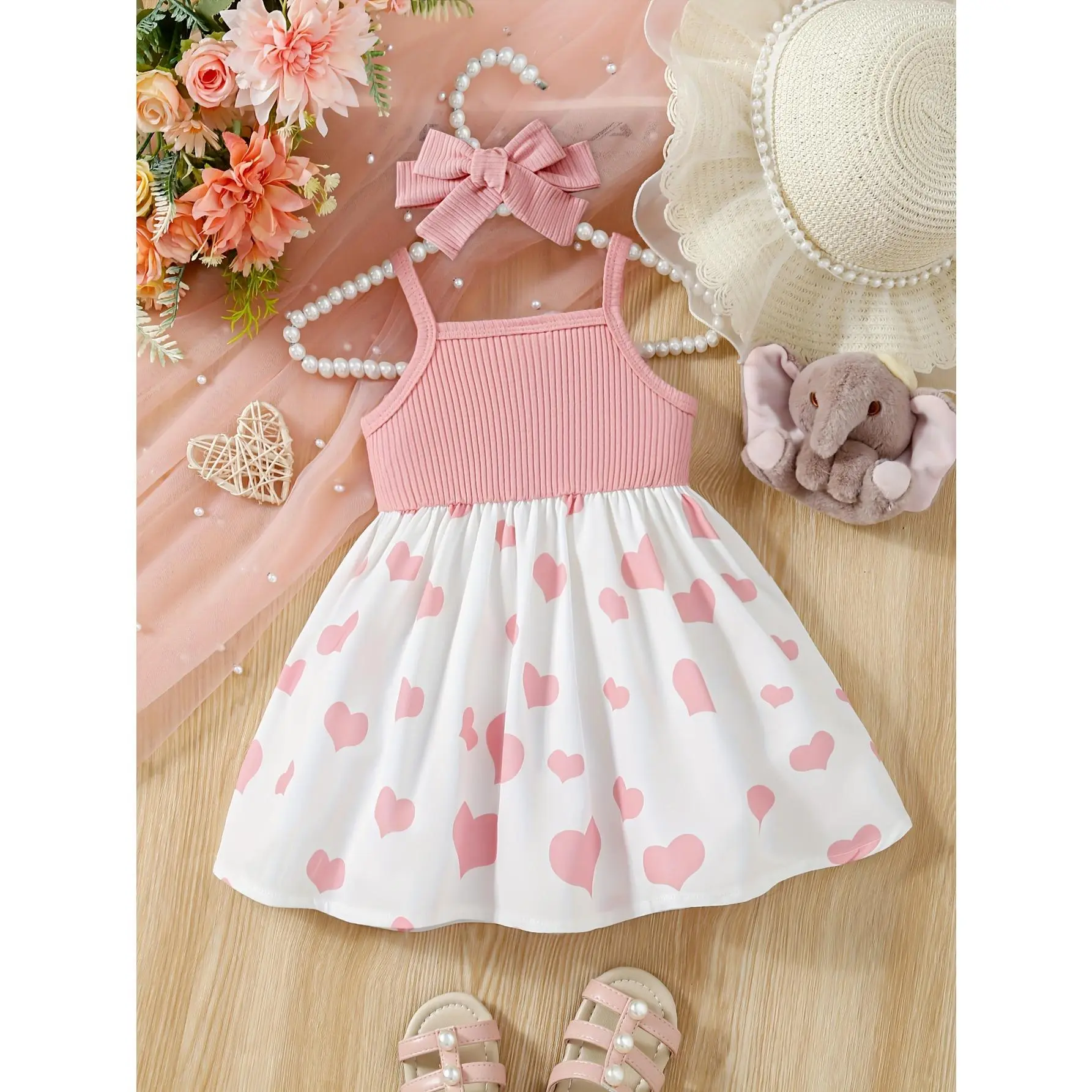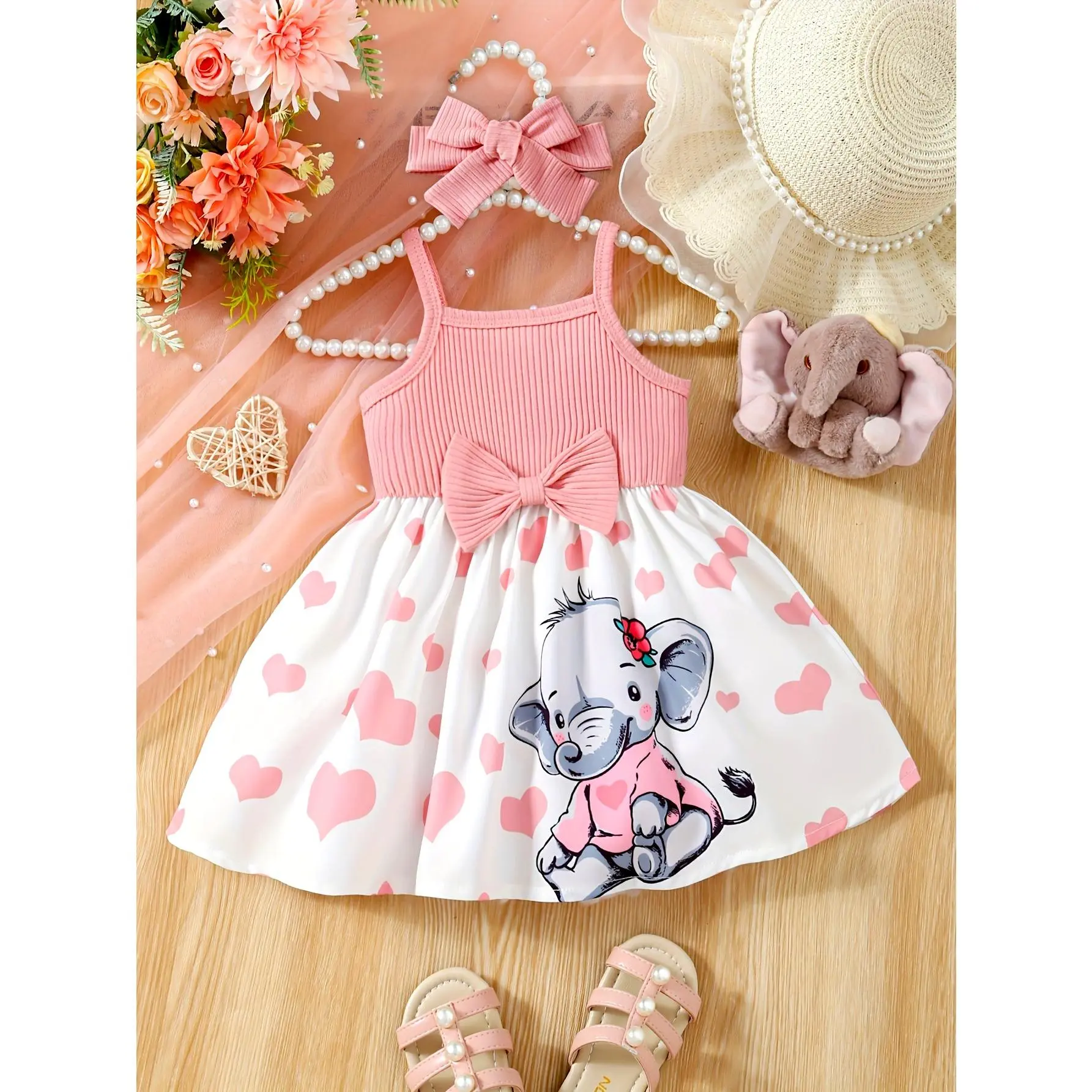 (New)Baby's Cartoon Elephant & Heart Pattern Cami Dress Set, Lovely Bowknot Decor Sleeveless Dress & Headband, Infant & Toddler Girl's Clothing for Summer/Spring, As Gift