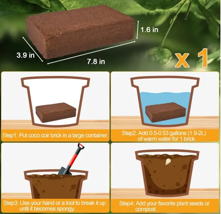 ·【Sustainable】Made from the fibrous husk of coconuts, our coco coir brick is a renewable alternative to traditional soil. Each brick measures 7.8x3.9x1.6 inches and weight 1.3 pounds