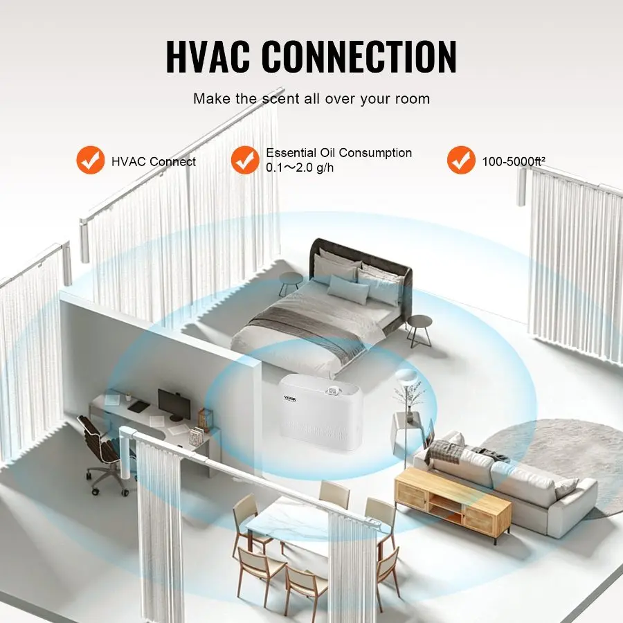 Elevate your space with VEVOR HVAC scent air machine for home! With cold air diffusion technology, 850ml large capacity, Bluetooth connectivity and 5000sq. ft coverage, our essential oil diffuser is the perfect addition to home or commercial use, providing a stylish scent experience that lasts.