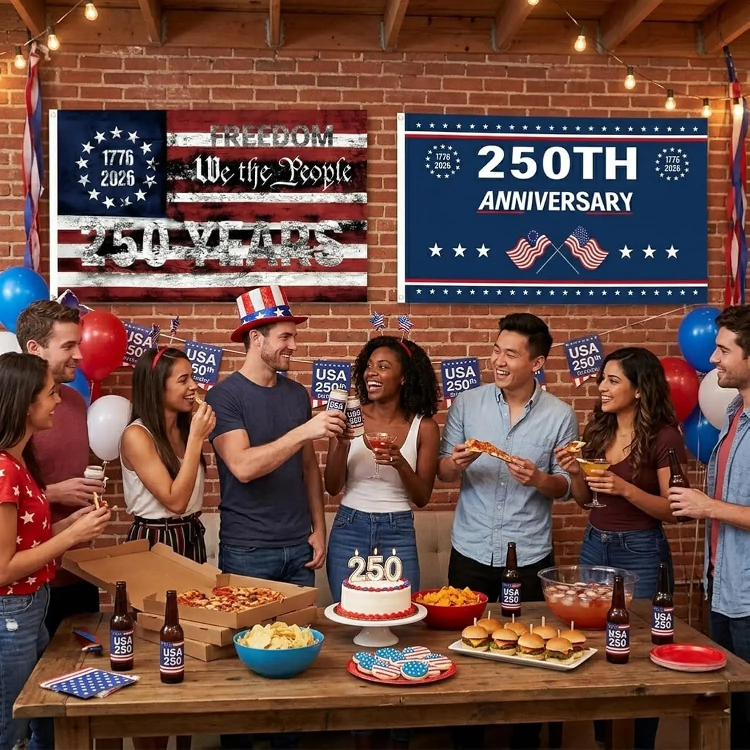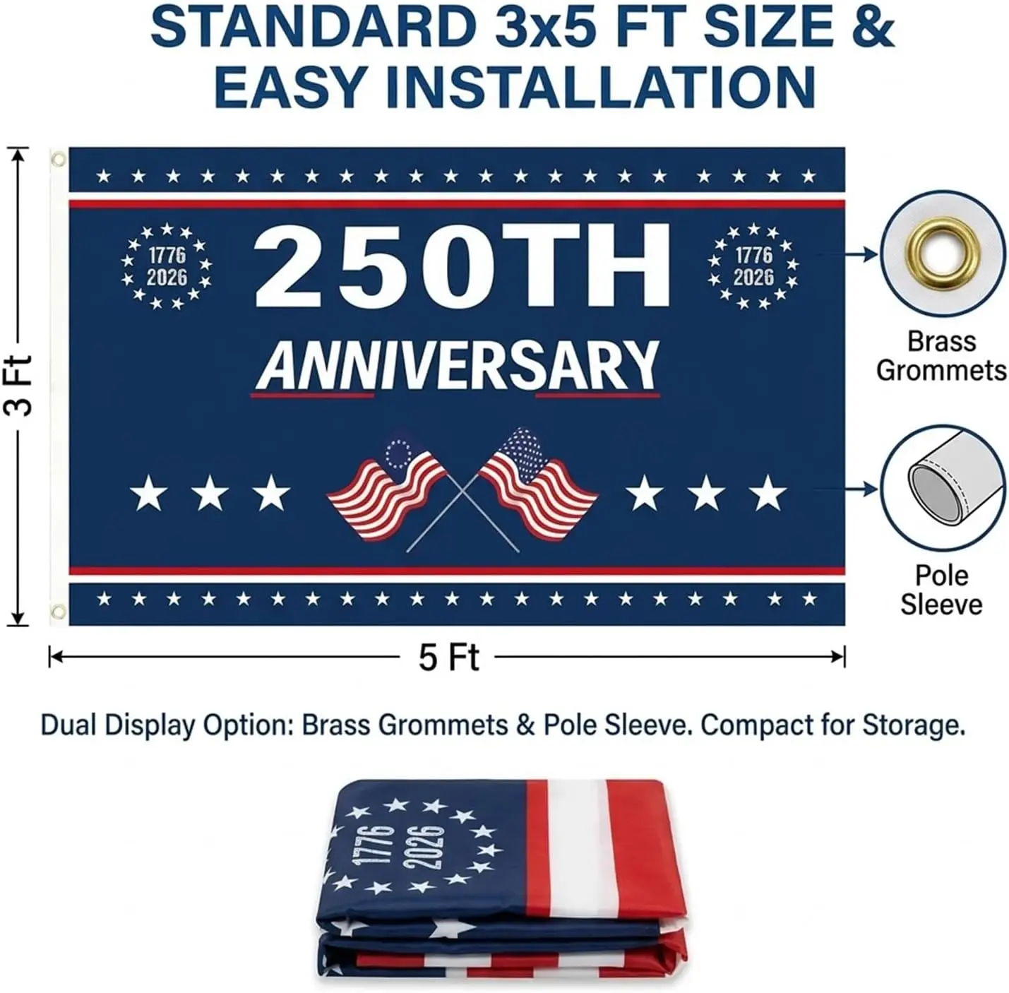 ·[Product Size]: 3x5 Ft (90x150 cm), The flag has 2 brass grommets, easy to hang. Designed with a classic 250th anniversary pattern for a visually appealing decoration.