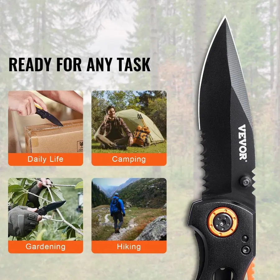 With 7Cr17MoV blade and partially serrated blade, our pocket knife is ideal for cutting wood, wires, ropes, and other tough materials. The thumb stud allows effortless single-handed operation, and aluminum handle offers an ergonomic grip. Serve as a self-defense tool if necessary.