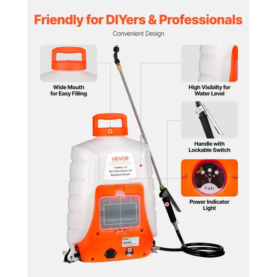 VEVOR Battery Powered Backpack Sprayer, 0-90 PSI Adjustable Pressure, 4 Gallon Tank, Back Pack Sprayer with 8 Nozzles and 2 Wands, 12V 8Ah Battery, Wide Mouth Lid for Weeding, Spraying, CleaningHigh-efficiency SprayingEverything You NeedEase Your Hand FatigueTranslucent TankAdjustable Shoulder StrapsEndless UseMax. Flow Rate: 4.1 L/Min, Battery: 12V/8Ah Lithium-ion, Product Weight: 4.7 kg/ 10.4 lbs, Material: HDPE 5002, Product Dimensions: 14x 7.3x 21/ 35.5x 18.5x 53.5 cm, Pressure: 0-90 PSI