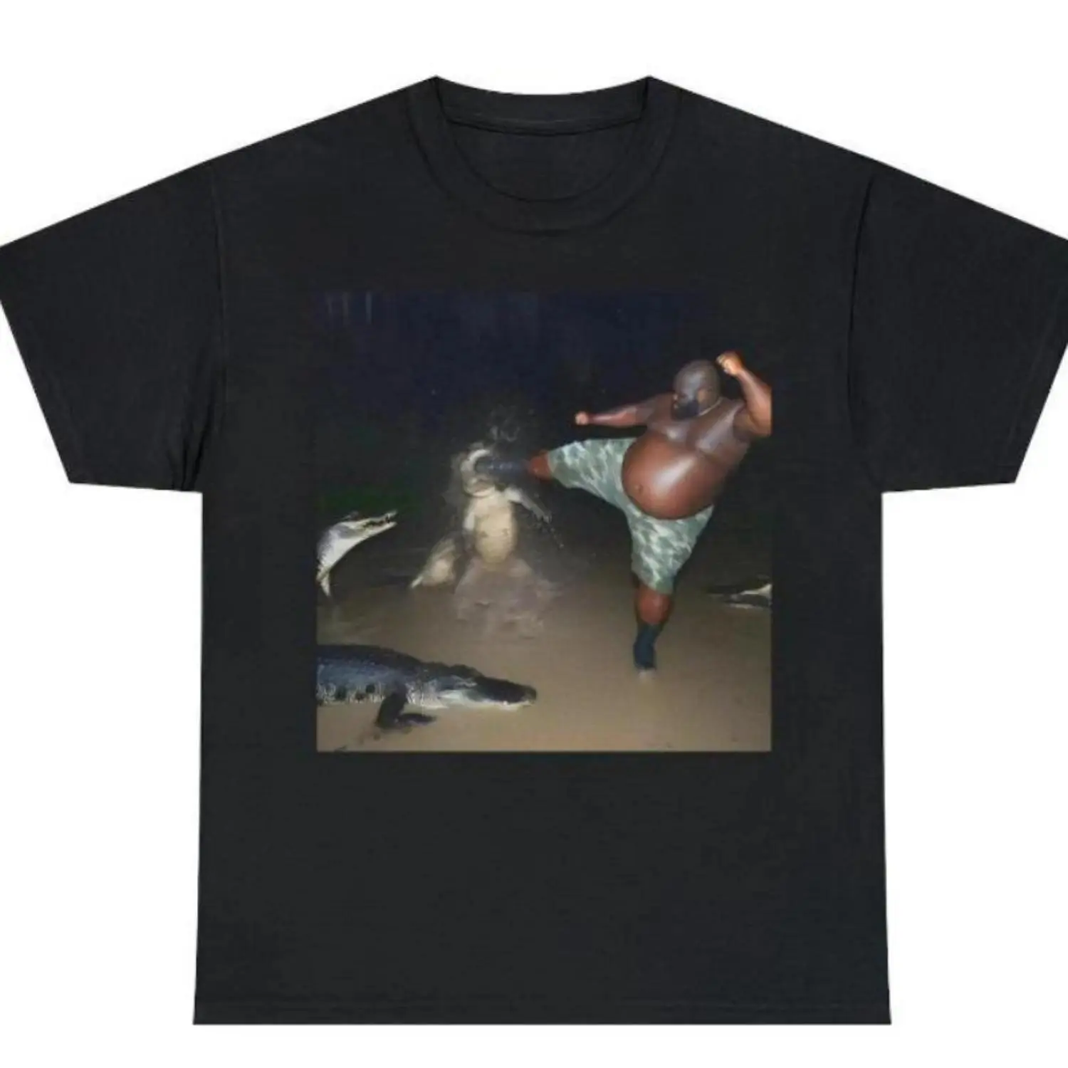 Humorous Unisex Swamp Man Kicks Alligator Meme Shirt in All Sizes