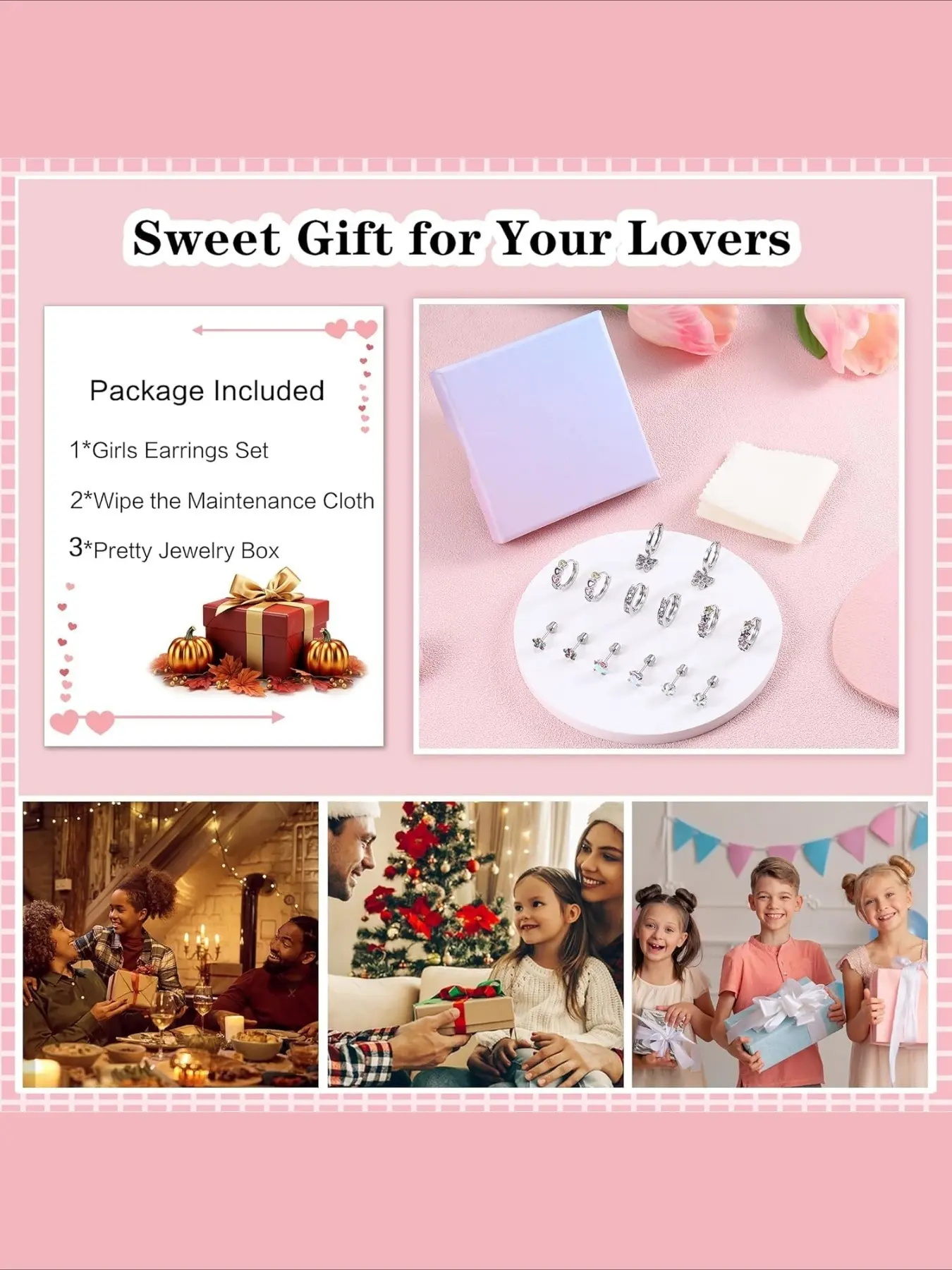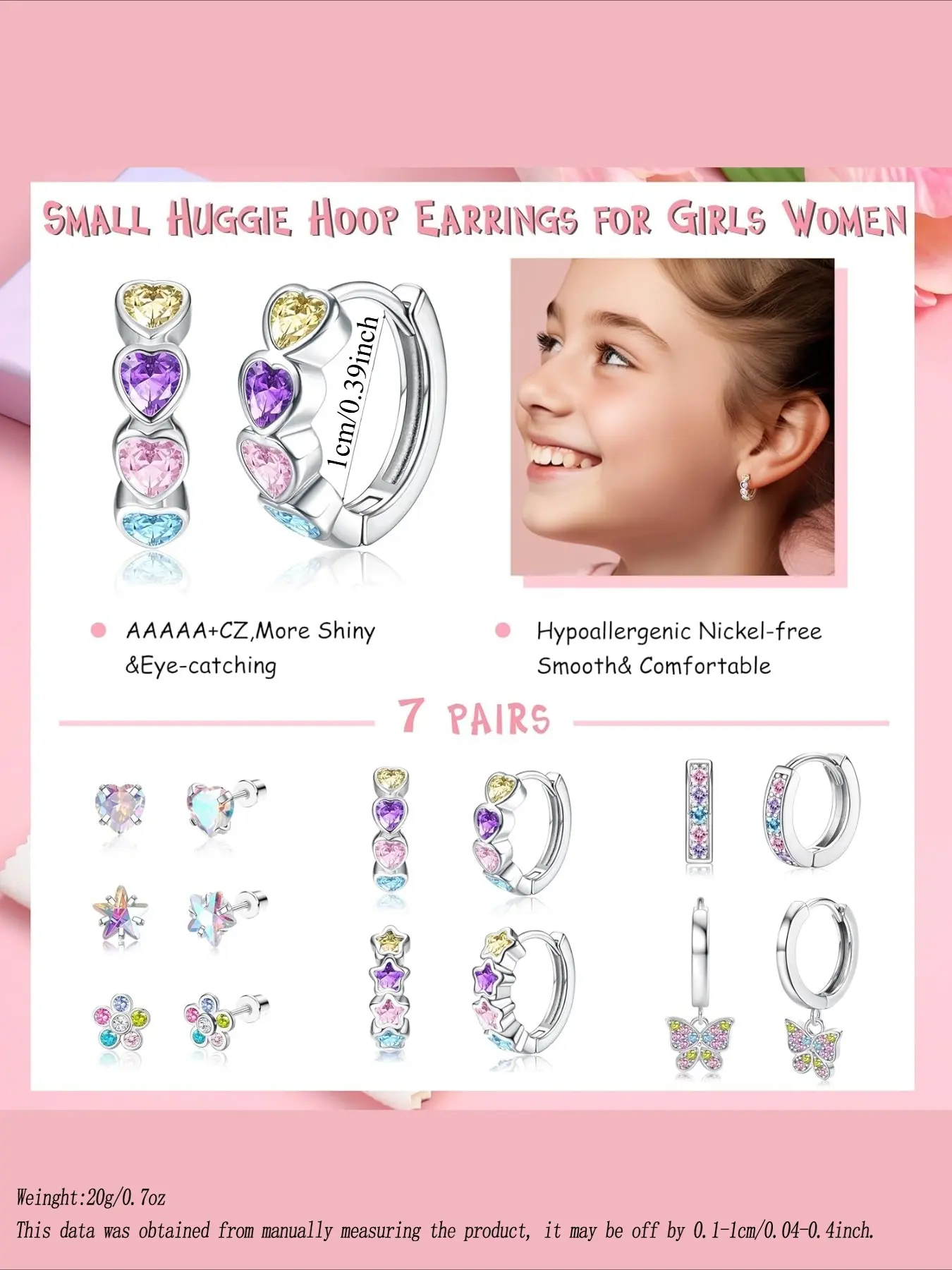 7 Pairs Hypoallergenic Silver Huggie Hoop Earrings for Girls Women Small Surgical Steel Earrings Cute Heart Dangle Earrings Set Pink Colorful CZ Star Flower Screw Back Stud Earrings for Kids