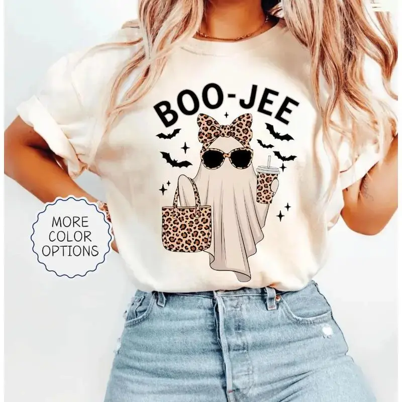 Boo-Jee Ghost Unisex Cotton T-Shirt, Leopard Ghost Tee, Ghost Coffee Funny Fall Shirt, Girly Halloween Gift, Boojee Shirt Casual Breathable Design Round Neck