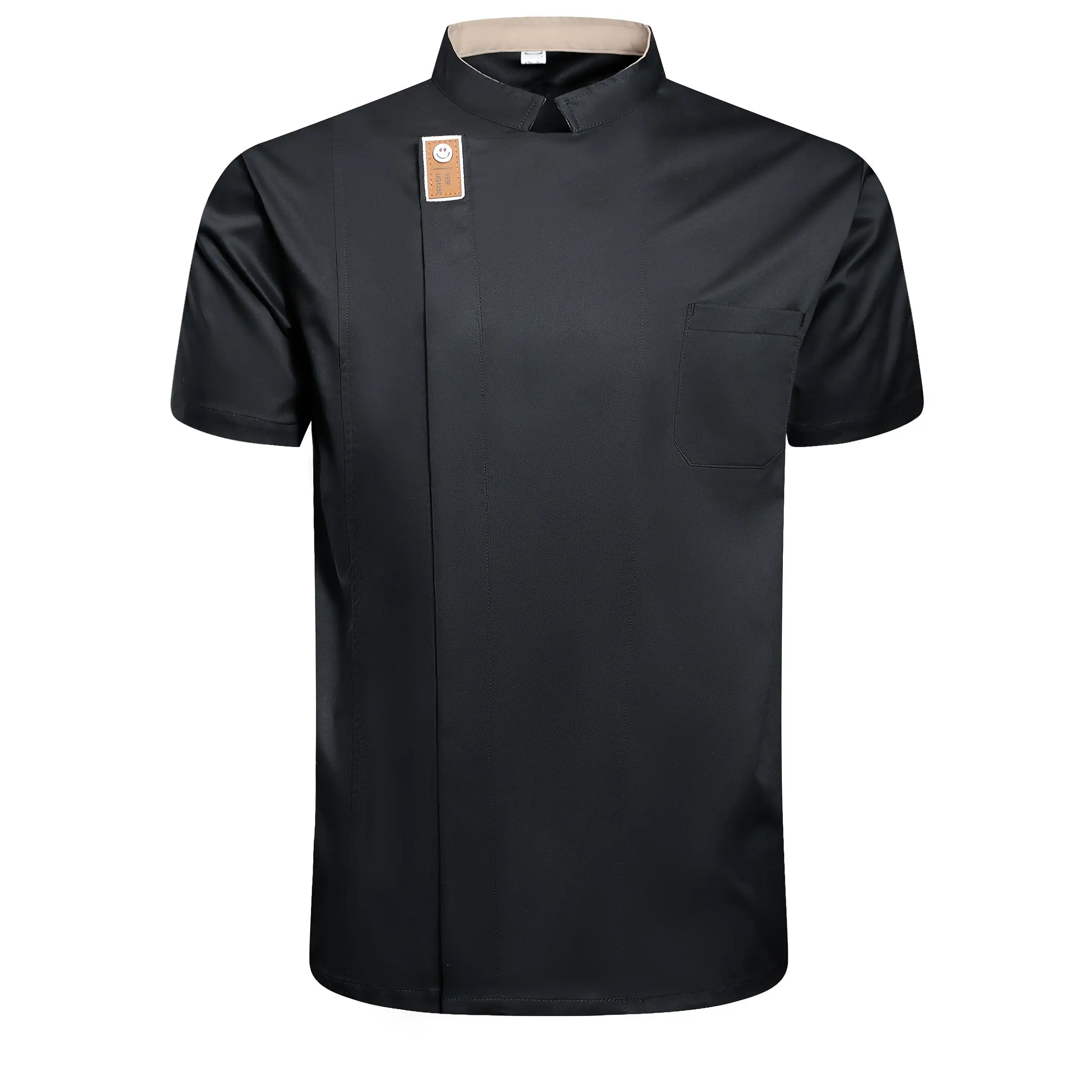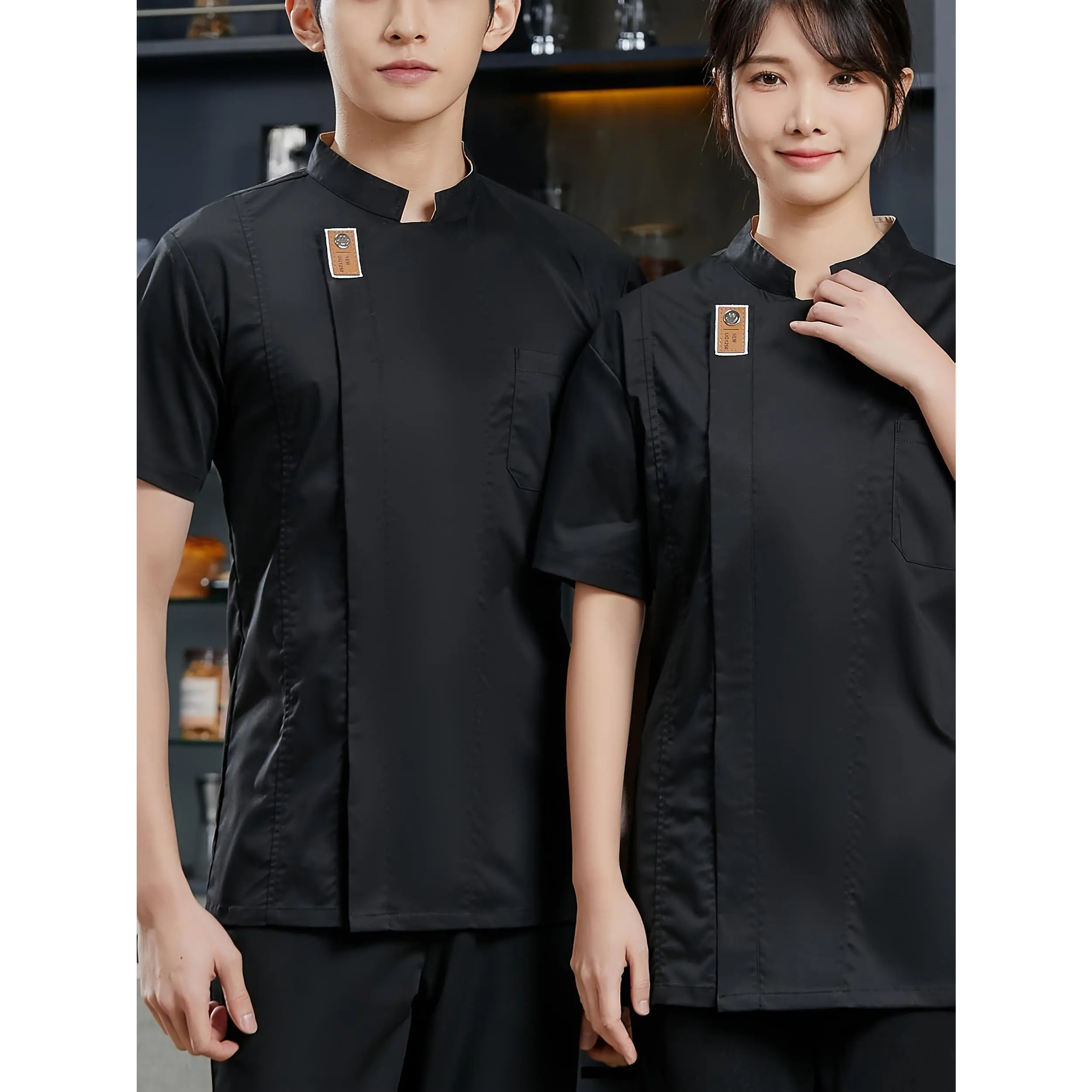 [Black Chef Uniform] Stylish Black Professional Chef Uniform - Short Sleeve Jacket with Pockets, Stand Collar, Polyester Fabric |     Ideal for Kitchen, Baking, and Restaurant Use, School Cafeteria Clothing, Machine Washable233
