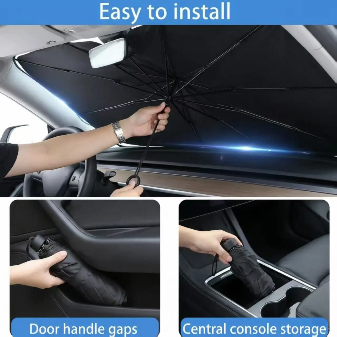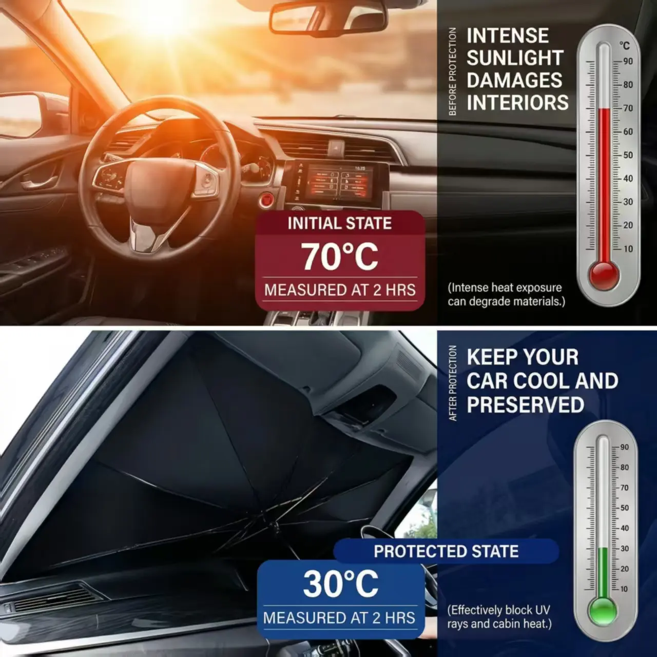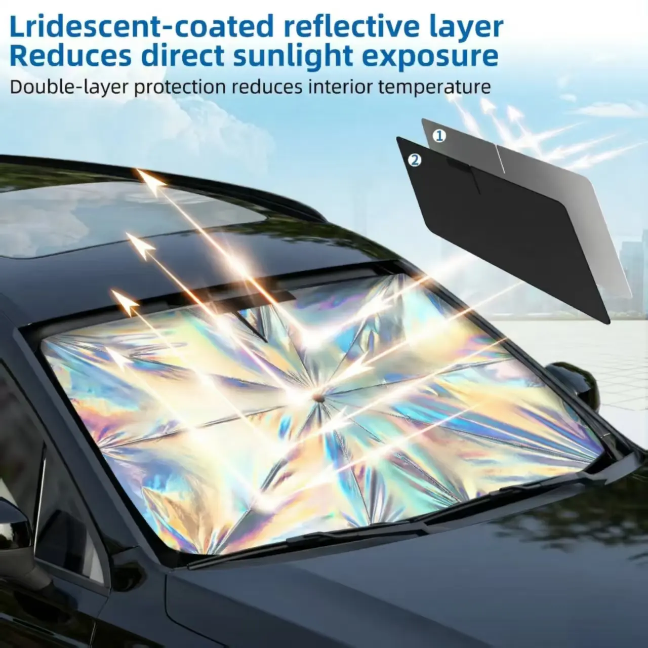 ·Double Thickened Foldable Car Sun Shade with full cover design, perfect to fit car interiors. This Portable Foldable Car Windshield Sunshade is a car cooler, sun blocker, and automotive sun shield, ideal for car camping. Featuring polarized car sun visor and lasersun shade for sun shade protection and interior cooling. A summer car essential to protect car windshield sun, car interior, with premium car shades.