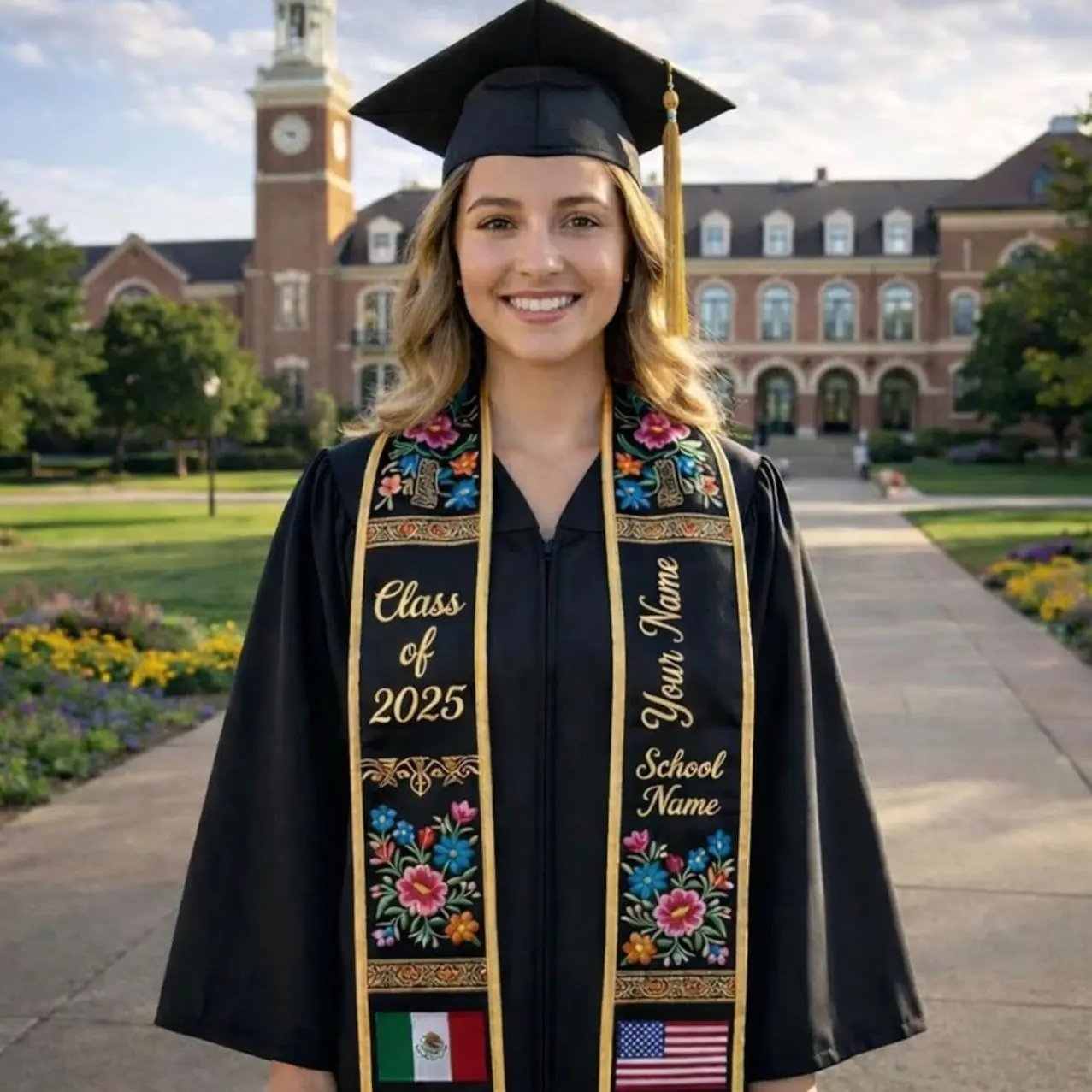 Personalized Flag Graduation Stole, Custom Mexican Grad Sash, Two Flag Yard Stoles, Class of 2026, Flag Graduation Sash