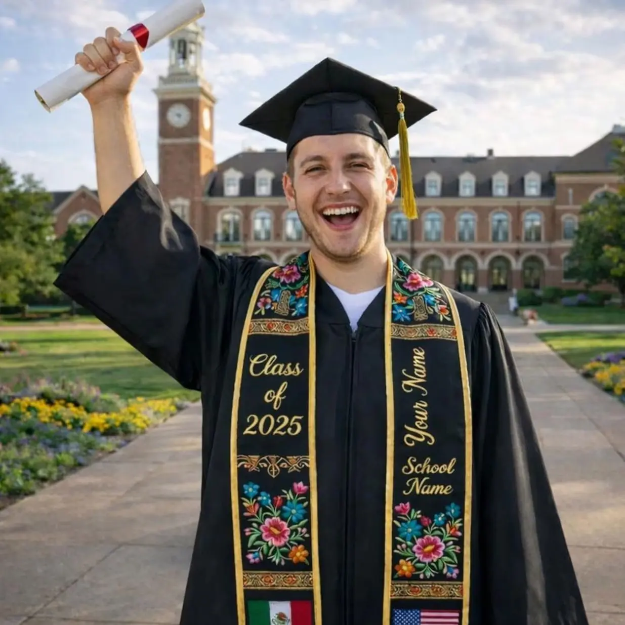 ·Fully printed with custom design: Personalize your graduation attire with your own school colors, emblem, motto, unique message, or even your own images.