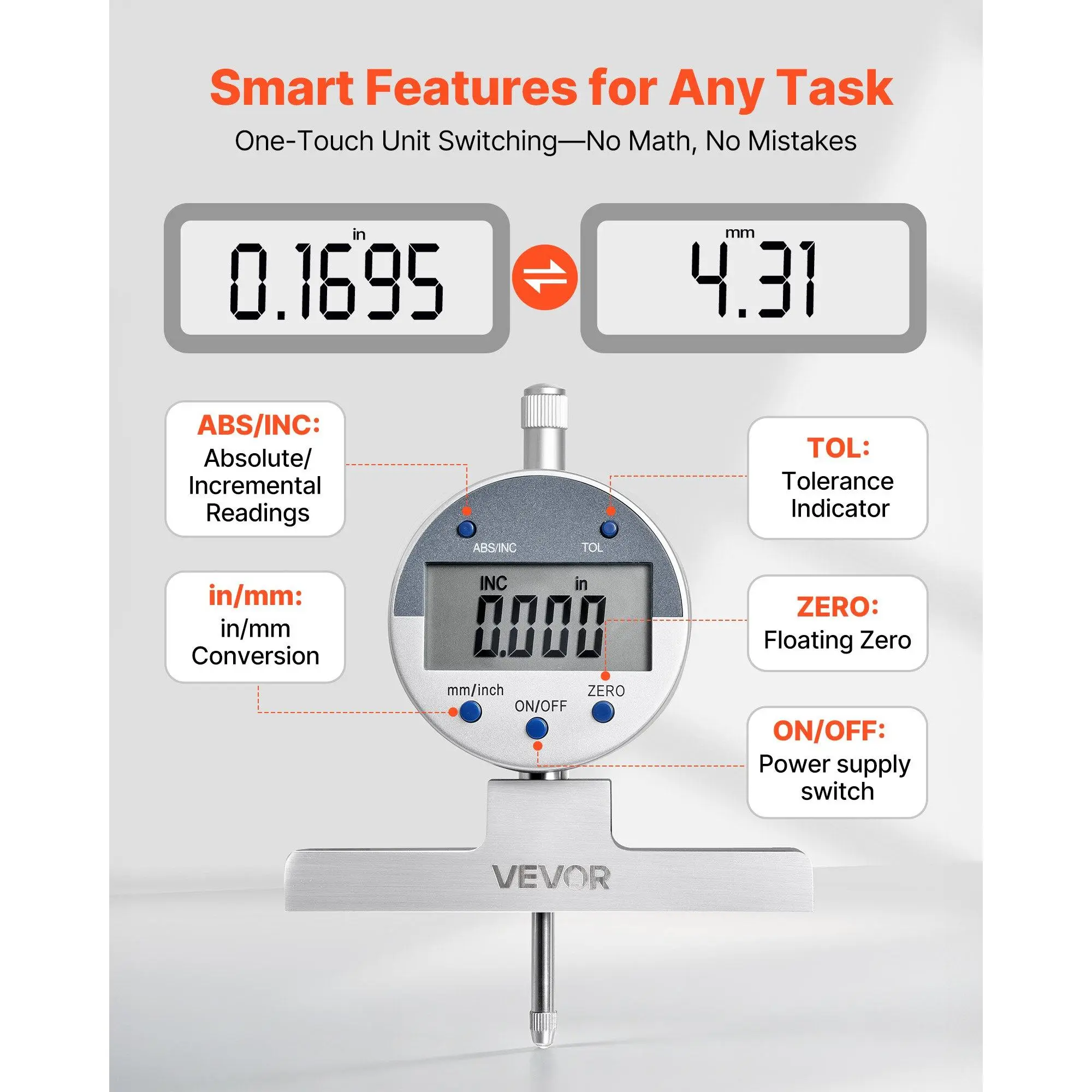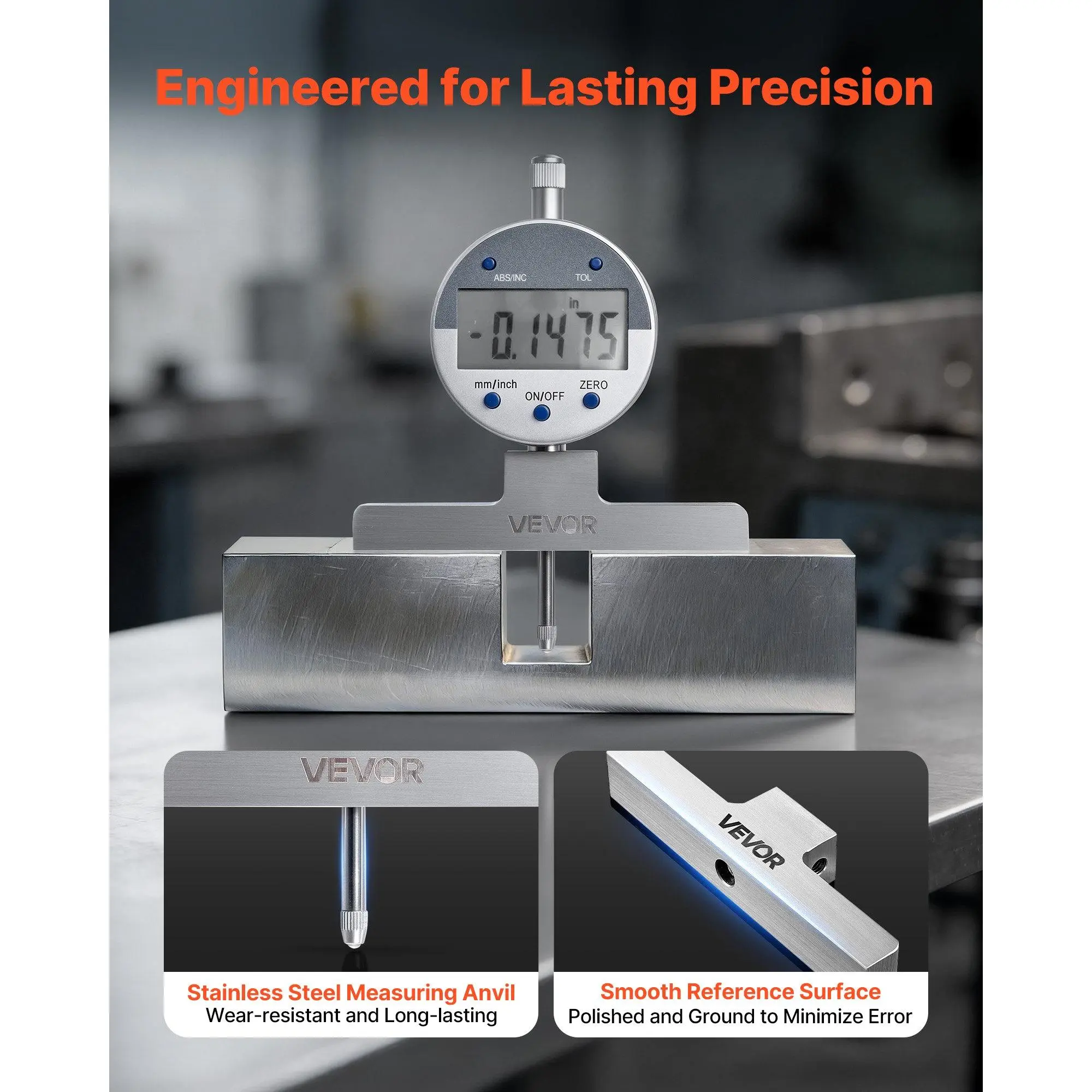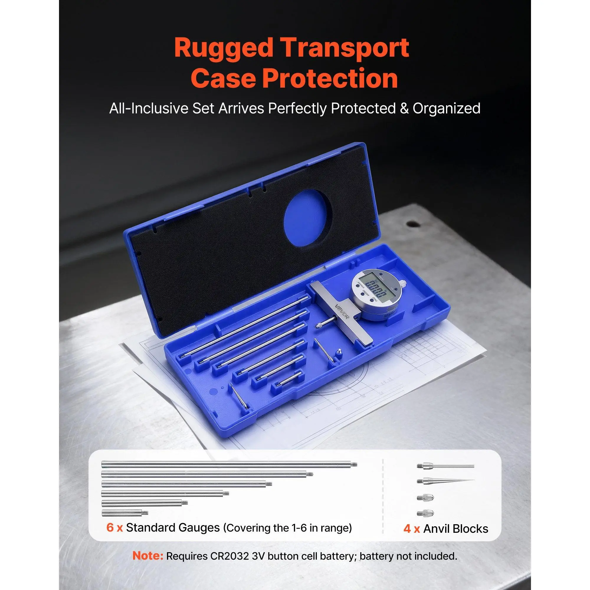 High-Precision Micrometer Set: This depth micrometer delivers accurate, reliable linear readings with a 1–2 in/25.4–50.8 mm range, ±0.001 in/±0.02 mm accuracy, and 0.0005 in/0.01 mm resolution.Ideal for measuring engine parts or precision componentsSmart & Convenient Operation: This micrometer features a large LCD for clear readings and one-button unit switching between imperial and metric.The zero-setting function enables calibration at any position for faster comparisons and repeat measurementsPrecise Measuring: This depth gauge features stainless-steel anvils and smooth reference faces to securely hold workpieces and avoid measurement errors.The solid metal frame offers excellent wear resistance and long-term stability for workshop useVersatile Measurement Tasks: This depth gauges include four anvils to suit different workpieces.Six calibration rods can be combined for a 0–22 in range, ideal for measuring metal sheets, grooves, and other depths, meeting professional metalworking needsComplete Set Included: This depth gauge tool comes with a hard case containing one depth micrometer, six rods, four anvils, and instructions.Keeps tools organized and portable, ready for immediate use in the field or lab without risk of lossVEVOR Depth Gauge, Depth Micrometer Digital Electronic Indicator 0-22 inch Measuring Range, 0.0005" Resolution, Precision Unit Conversion with 4 Anvils, Measuring Tool for Groove, Step, Hole