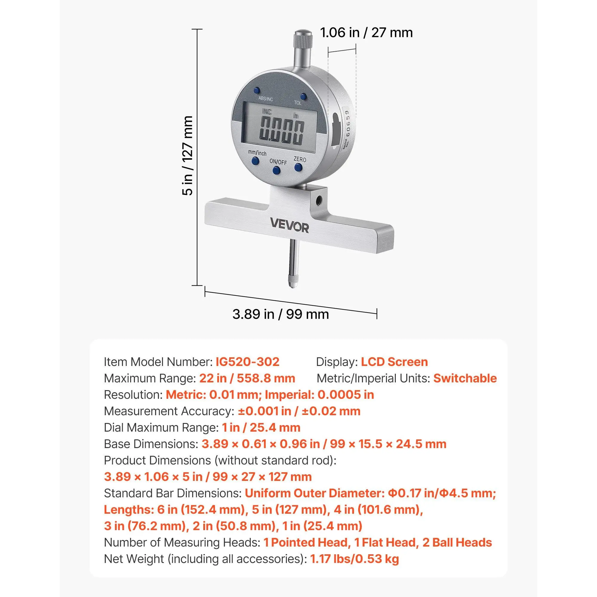 Maximum Range: 22 in / 558. 8 mm,Net Weight (including all accessories): 1. 17 lbs / 0. 53 kg,Item Model Number: IG520-302,Dial Maximum Range: 1 in / 25. 4 mm,Base Dimensions: 3. 89 x 0. 61 x 0. 96 in / 99 x 15. 5 x 24. 5 mm,Product Dimensions (without standard rod): 3. 89 x 1. 06 x 5 in / 99 x 27 x 127 mm,Metric/Imperial Units: Switchable,Measurement Accuracy: ±0. 001 in / ±0. 02 mm,Standard Bar Lengths: 6/5/4/3/2/1 in (152. 4/127/101. 6/76. 2/50. 8/25. 4 mm),Number of Measuring Heads: 1 Pointed Head, 1 Flat Head, 2 Ball Heads,Display: LCD Screen,Resolution: Metric: 0. 01 mm; Imperial: 0. 0005 in
