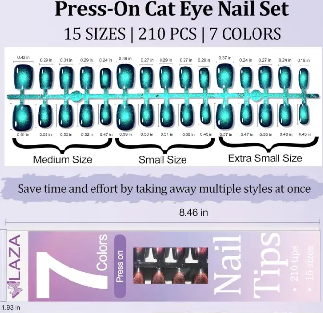 ·Dynamic 3D Cat Eye Effect:This chameleon press-on nail kit includes 7 trending colors (30 pieces per shade) and 15 sizes for XS/S/M nail bed fit. Using advanced 3D cat eye gel technology, each nail shifts between prismatic hues like starlight from metallic blues to rose gold ombre, capturing light at every angle for a mesmerizing galaxy effect.