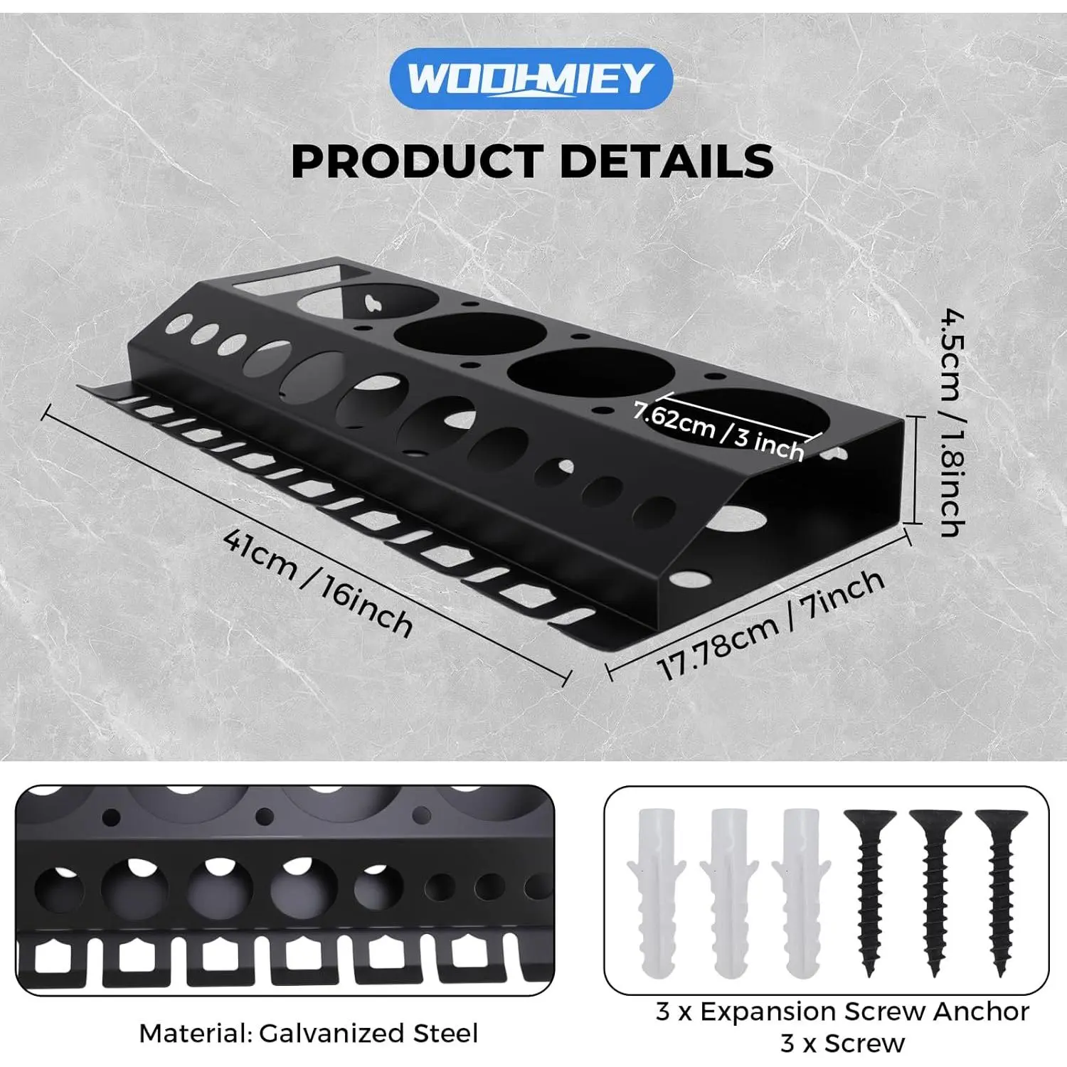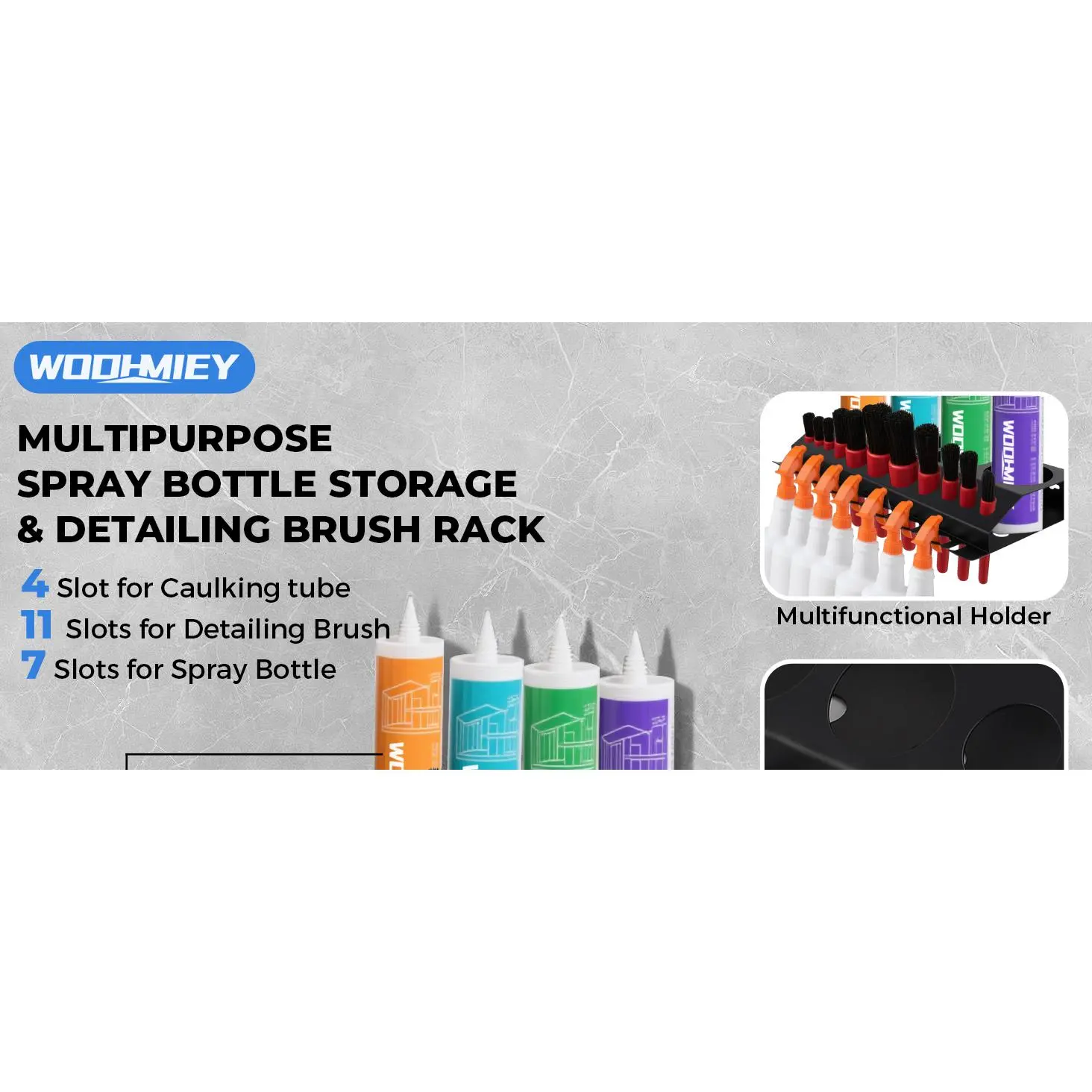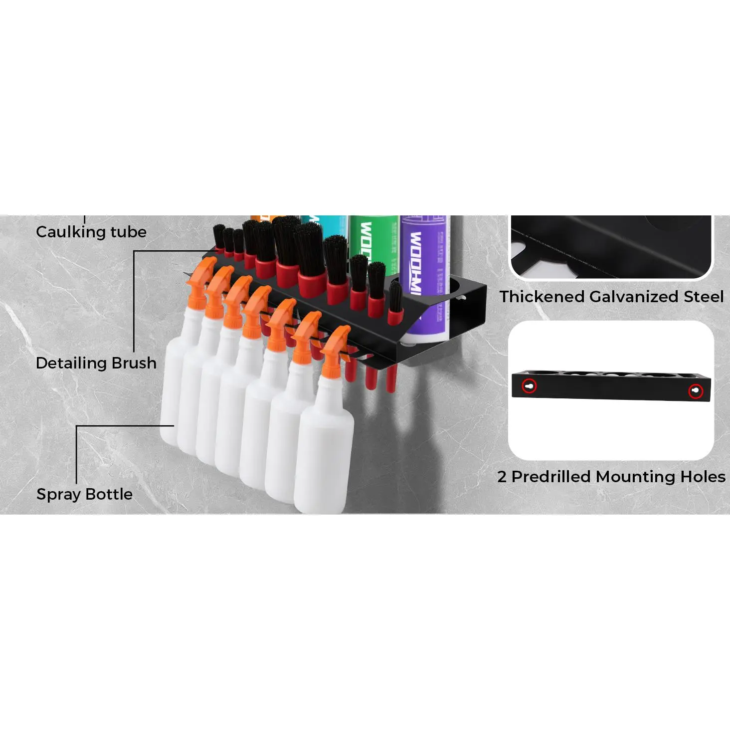 Practical Storage for Car Detailing Tasks - This versatile car detailing organizer and spray bottle holder for car detailing helps keep your workspace tidy.Whether used as a garage spray bottle holder or auto detailing bottle holder, it makes accessing your tools more convenient.Designed to Fit Most Detailing Tools - This detailing brush holder includes 4 spray bottle slots, 11 holes for brushes, and 7 hooks for sprayers.Built for users who need efficient and organized access to commonly used tools.Simple Installation, No Setup Needed - This wall mounted storage rack arrives fully built and is ready to mount using the included expansion screws.No tools or complicated steps-just a fast and secure install in your workspace.Flexible Mounting for Different Surfaces - Install this wall mount tool organizer on cement walls, wooden panels, or metal pegboards.It adjusts easily to a range of wall types, helping maintain a neat layout for detailing or repair work.Durable Metal Body with Protective Finish - Crafted from galvanized steel and coated with a black finish, this spray bottle holder wall mount provides solid resistance to surface damage and everyday wear. Built to stay sturdy under heavy use in garage settings.