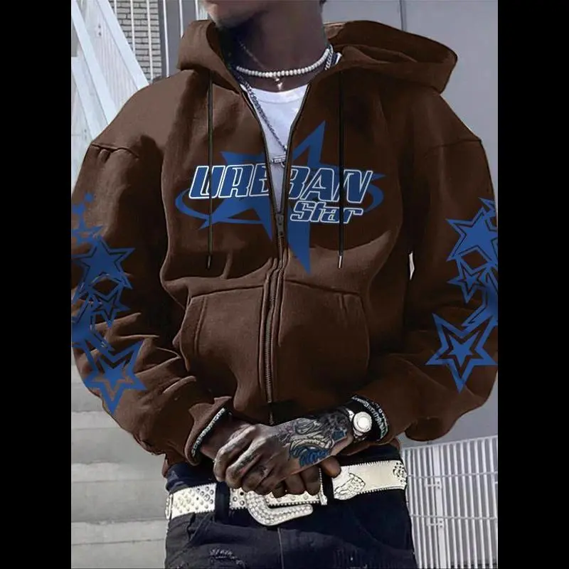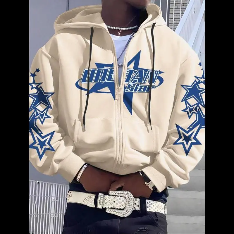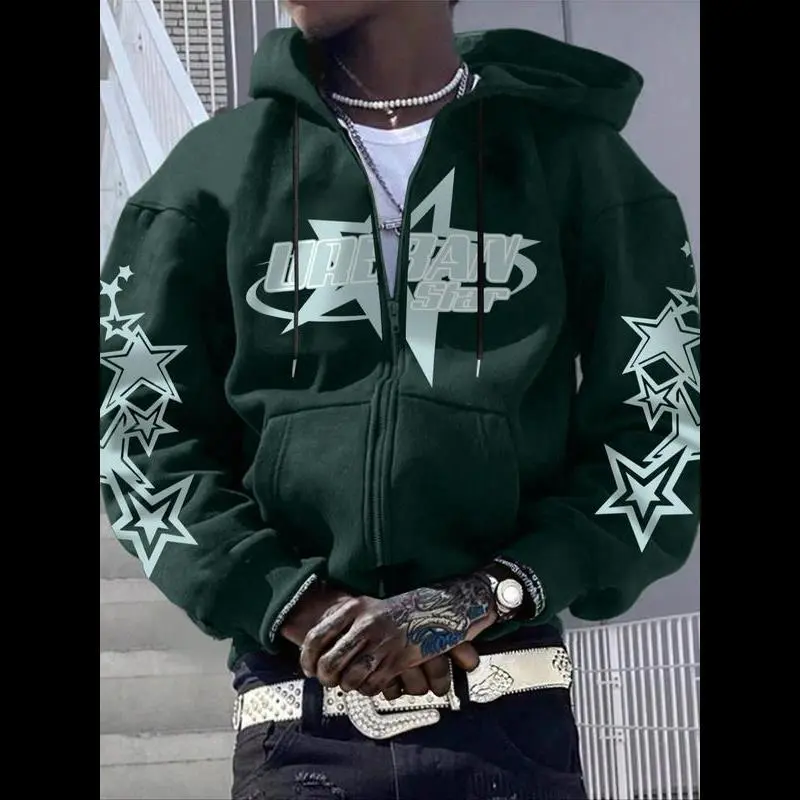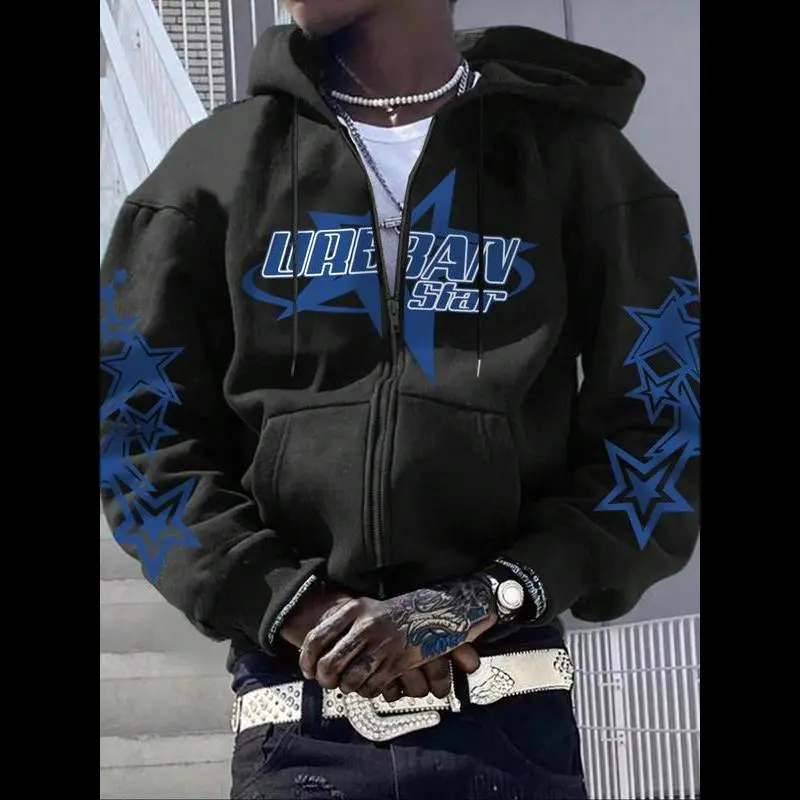 5. Men's Star & Letter Print Drop Shoulder Thermal Lined Zip Up Hoodie, Street Y2K Casual Regular Fit Drawstring Pocket Hooded Jacket for Daily Holiday Outdoor Wear, Men Clothes for Fall & Winter