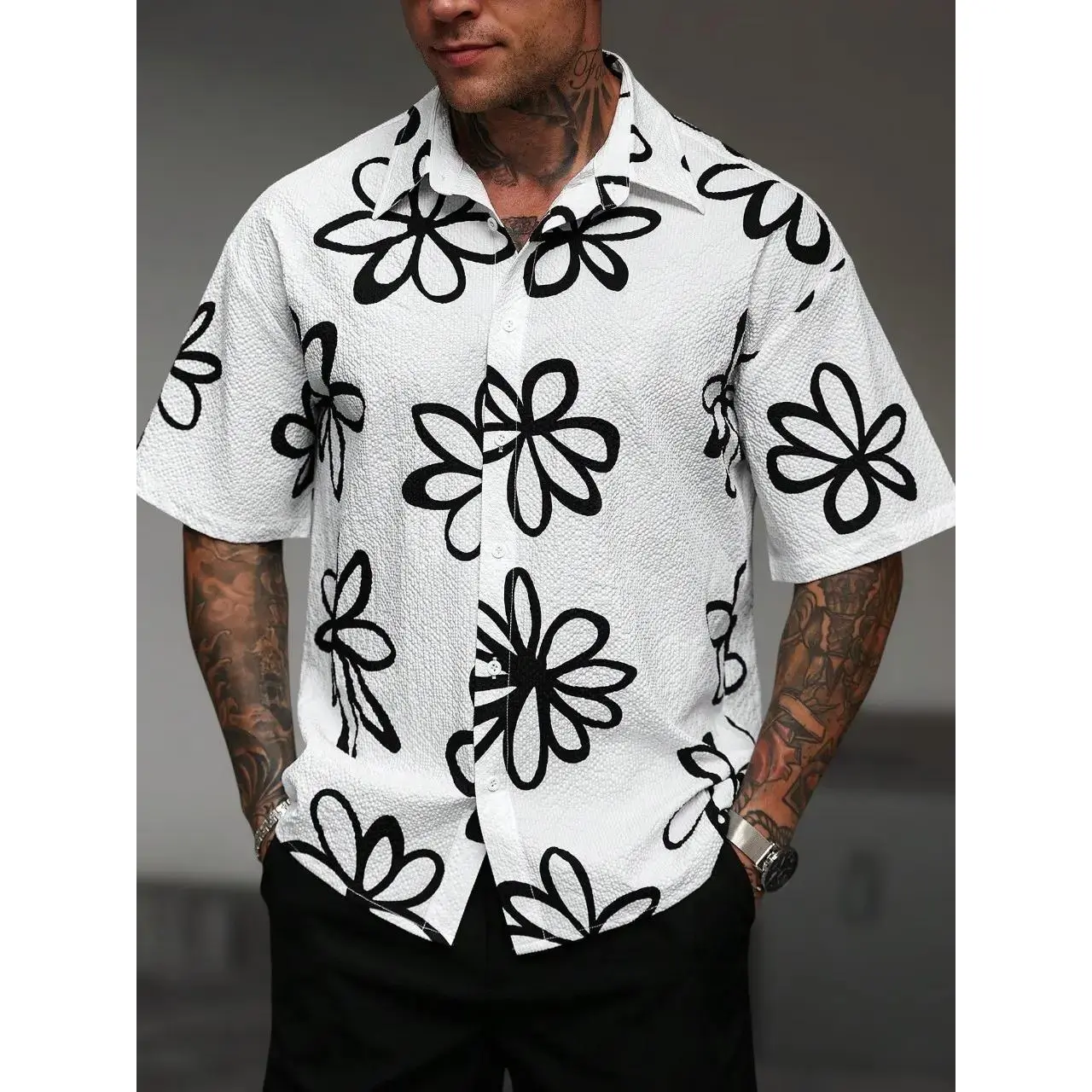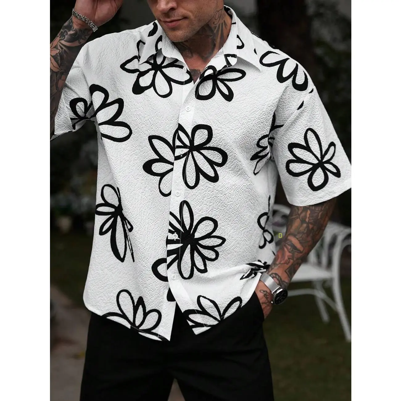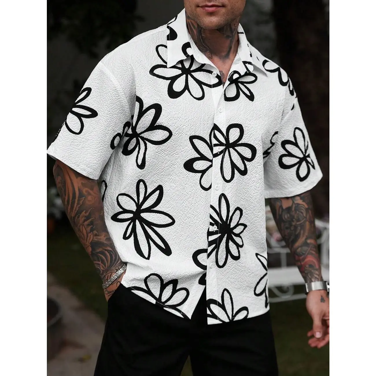 Summer deals clothes - Men's Casual Vacation Crinkled Black Bubble Gauze Short Sleeve Shirt With Simple Floral dad shirt dad gifts vintage shirts men gifts outfits men summer vacation outfits 90s vintage men clothing cropped shirt men Menswear Gamis