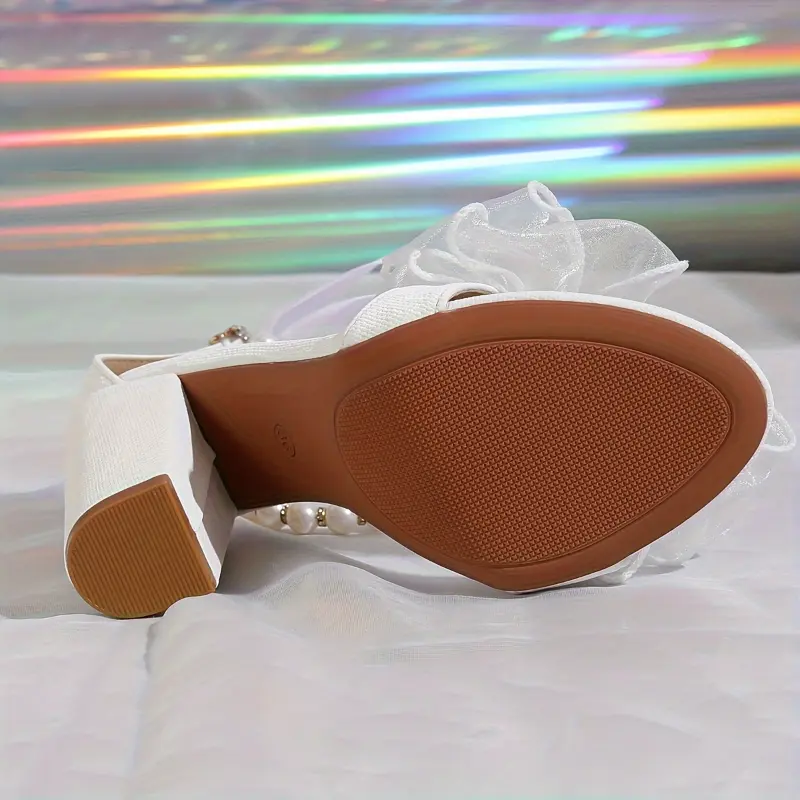 Ladies' White High-Heeled Chunky Sandals with Pearl Bow, Ultra-High Heels, And Nude Straps, Perfect for Spring And Summer. Stylish, Comfortable, And Versatile, These Sweet And Sexy Sandals Are Ideal for Parties, Nightclubs, Weddings, Valent
