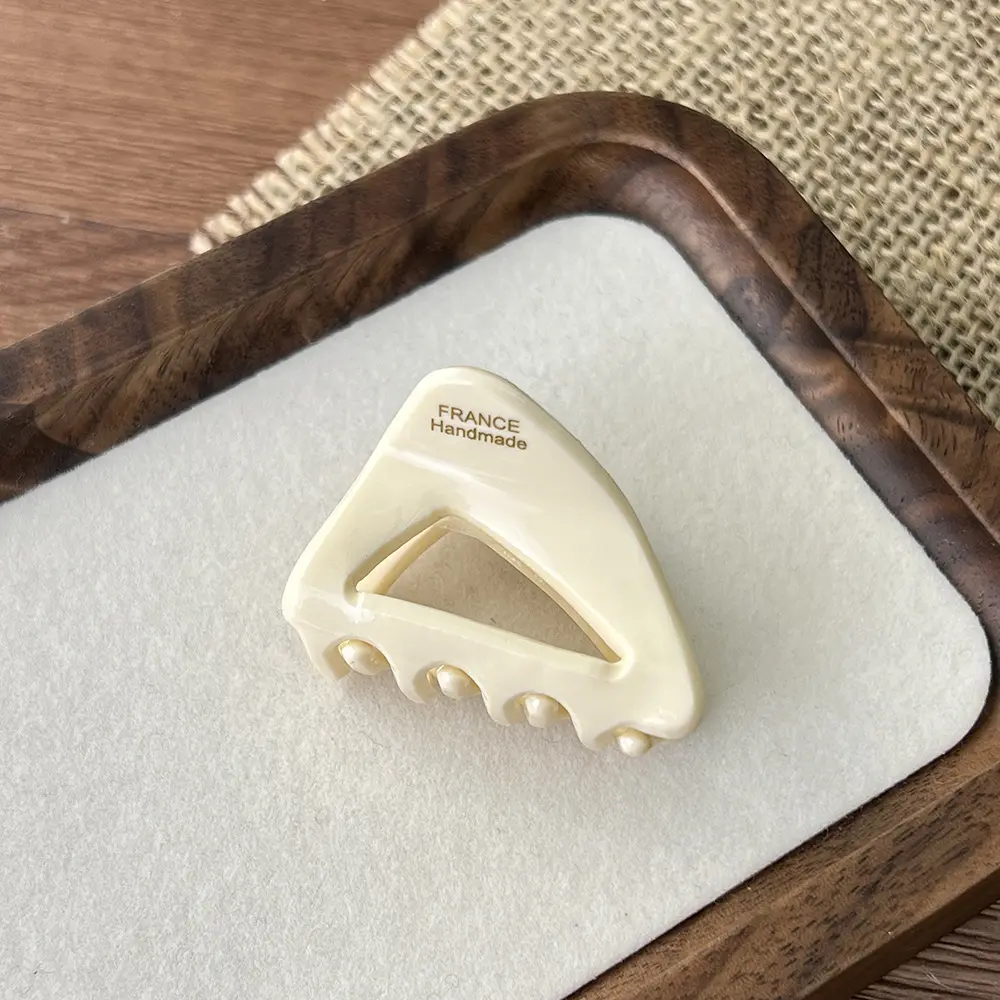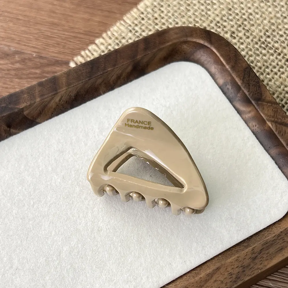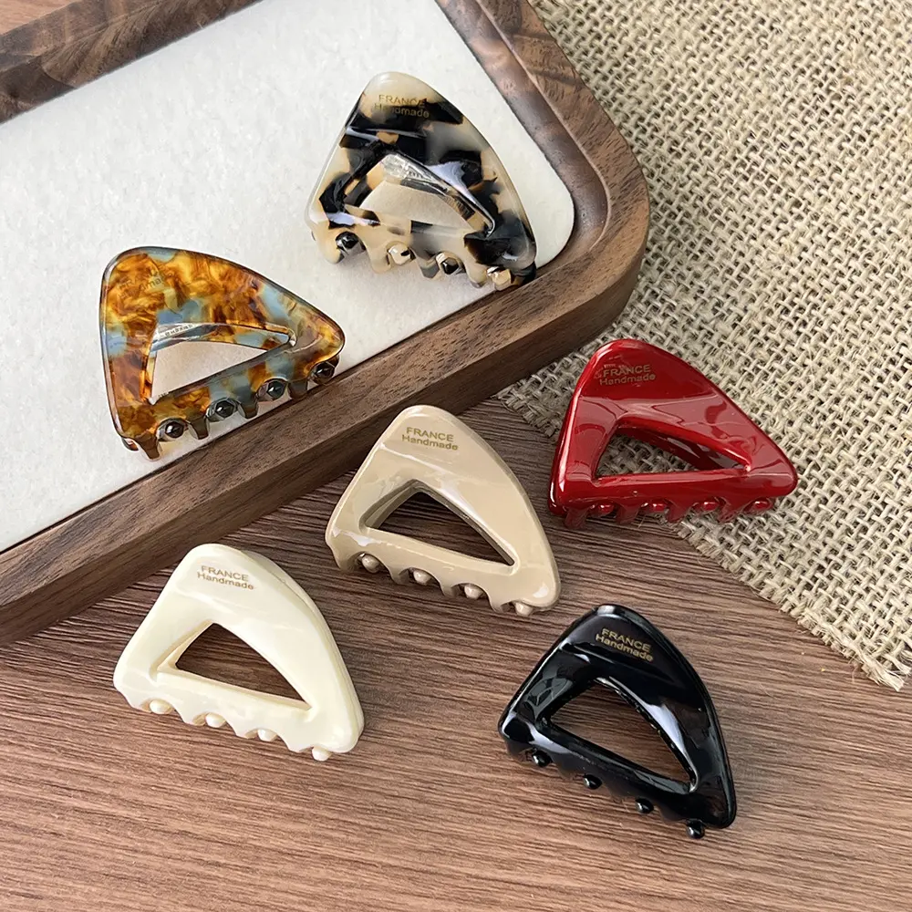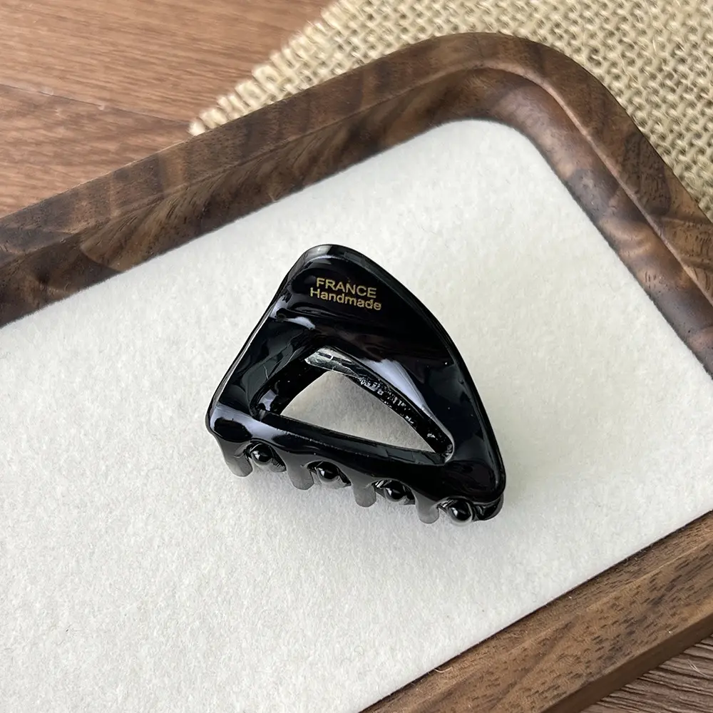 This French triangle hair clip set is made of acetate material, offering a transparent and durable texture.The clip teeth are designed for a secure grip, preventing slipping and hair pulling.Available in multiple colors such as tortoiseshell, milky white, pure black, and bright red, with the engraved words "FRANCE Handmade," it has a vintage and sophisticated look.Suitable for half-up hairstyles, buns, and updos, it is a versatile hair accessory for work, daily wear, and dates, easily creating a relaxed French style