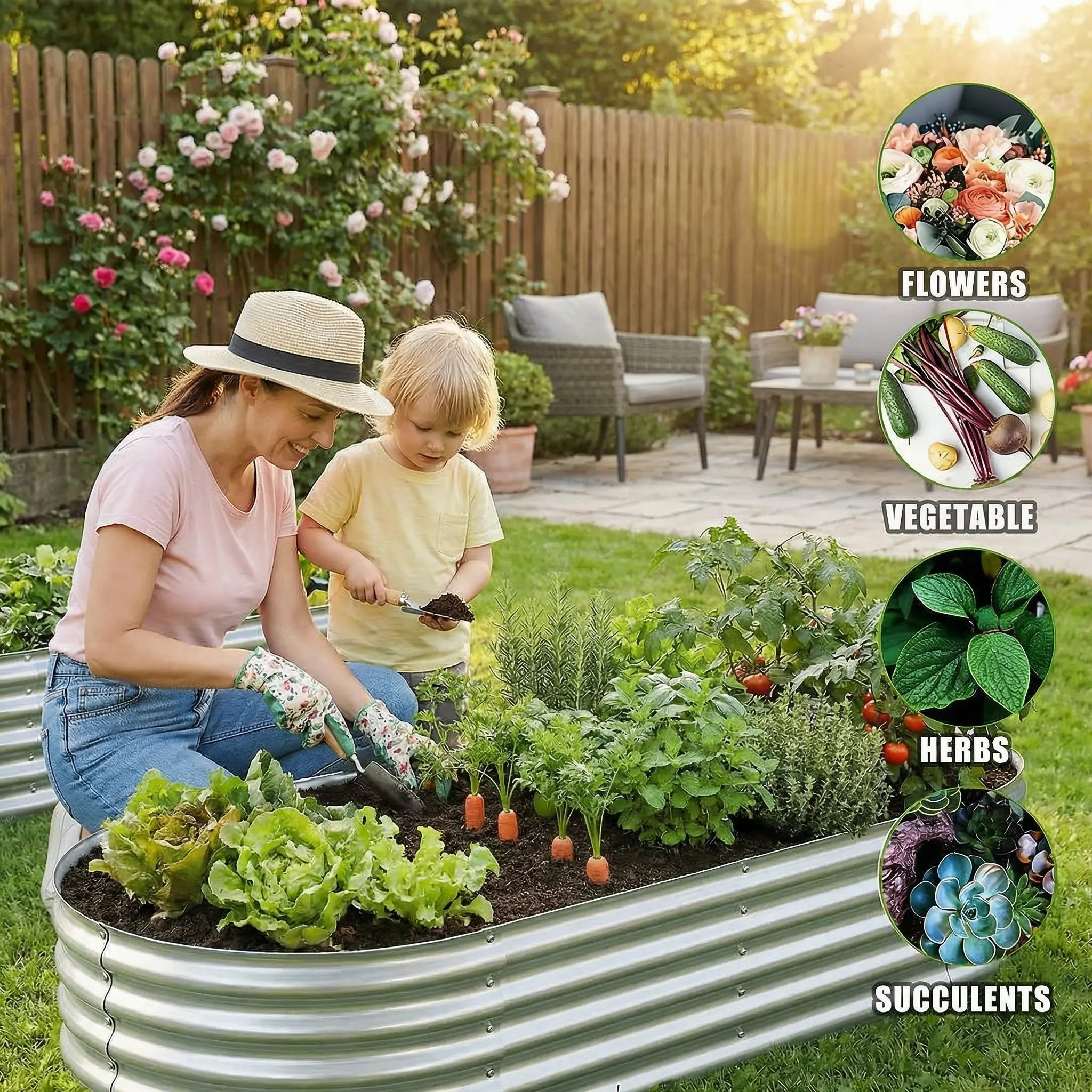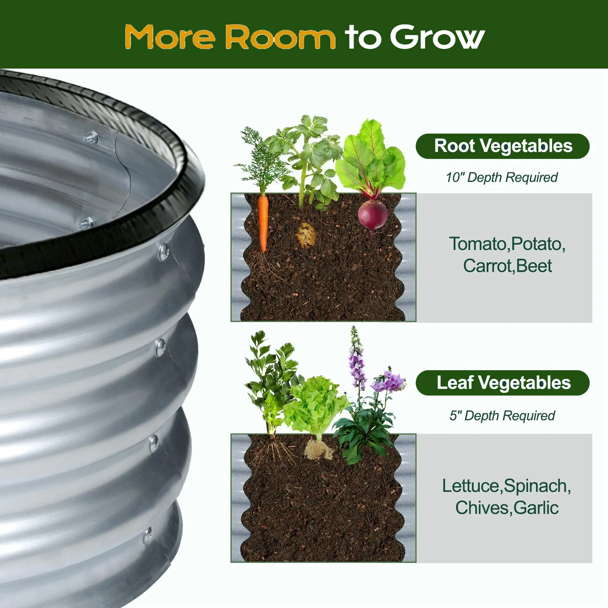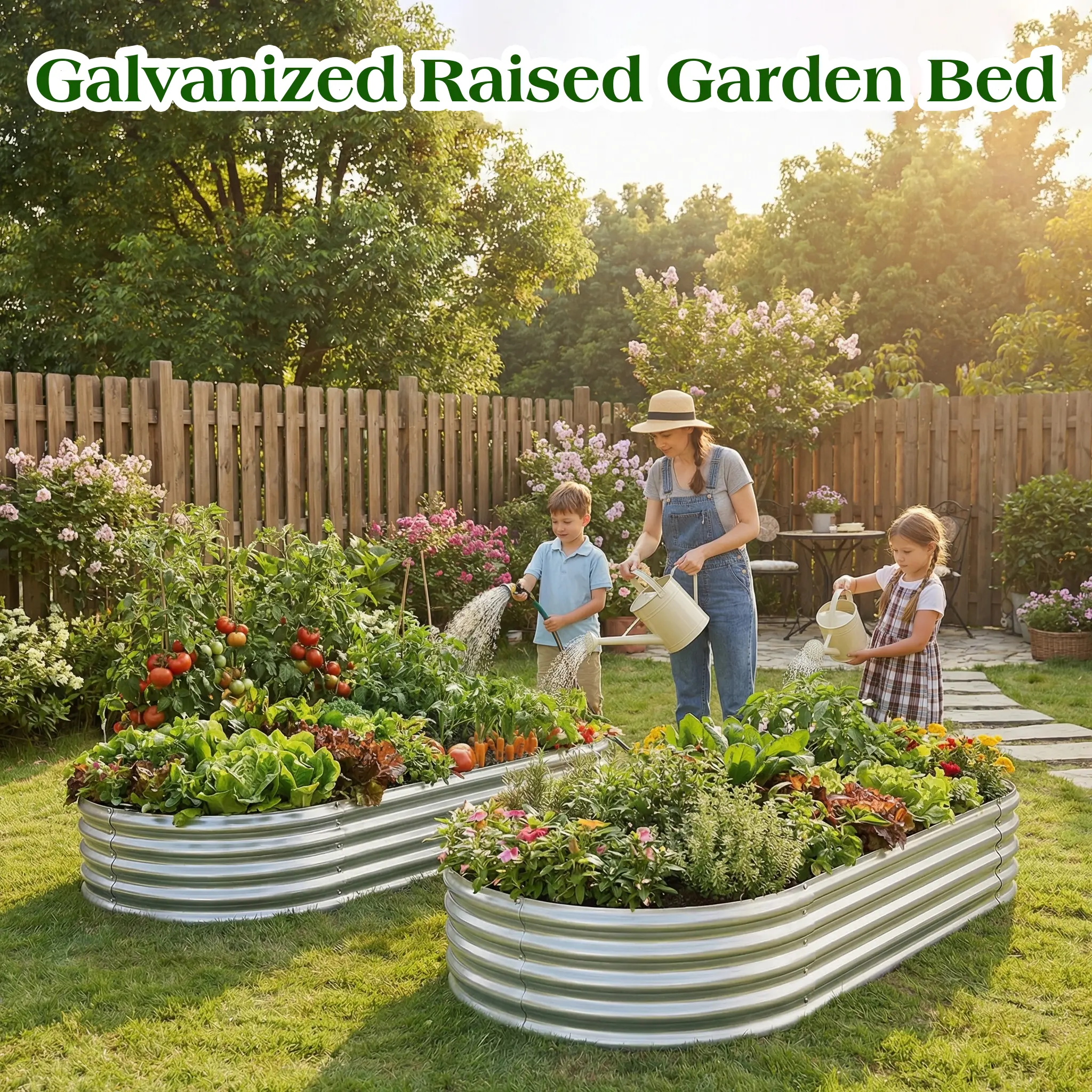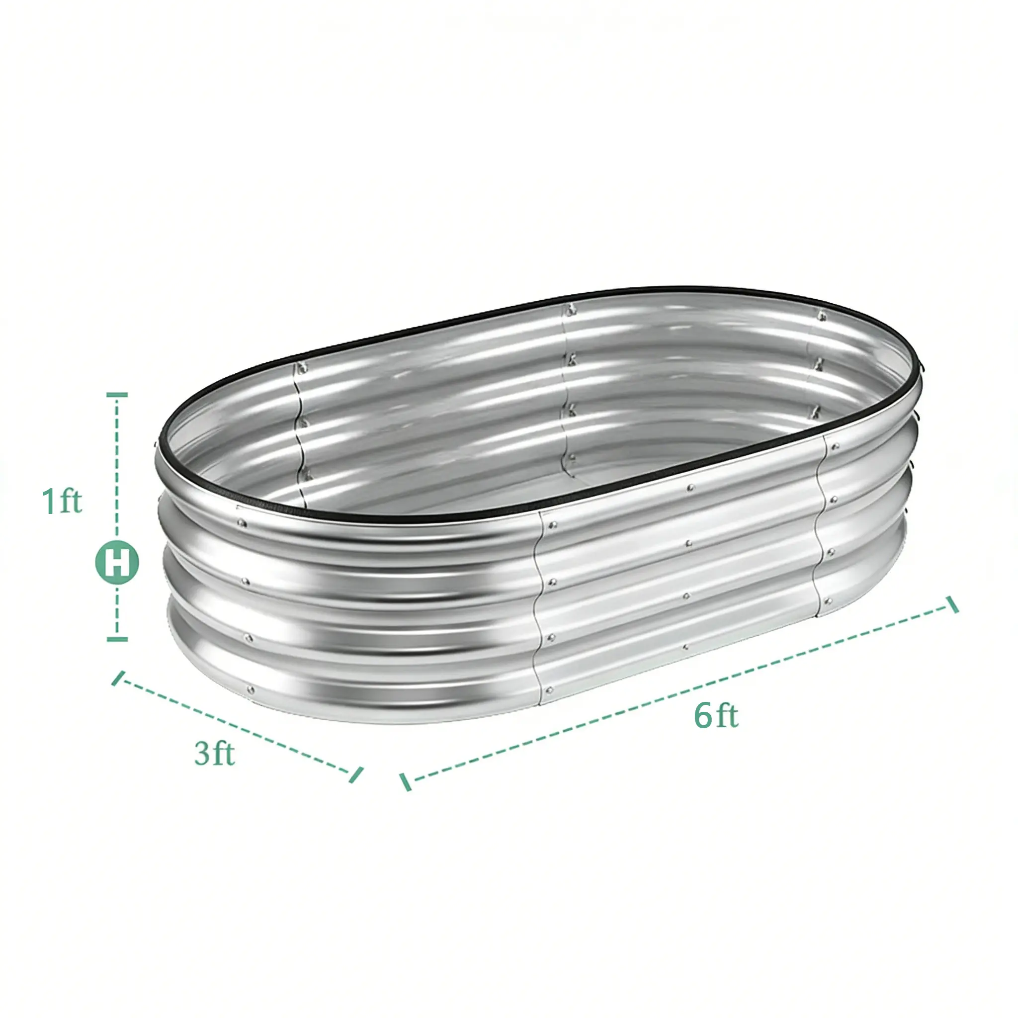 Core Specifications (Clear & Intuitive) - Type: Oval Galvanized Raised Garden Bed Kit - Size: 8*4*1(6*3*1) Ft (Large Size) - Material: High-Quality Galvanized Metal Sheets, Multi-Corrugated Structure - Surface Coating: Galvanized Anti-Corrosion Coating - Key Features: Bottomless Design (Natural Drainage), Easy Assembly, Enhanced Stability, Durable - Stability: Enhanced Metal Panel + Support Rods (Long Sides) - Application: Outdoor Vegetable Planting, Herbs, Small Fruits - Accessories: Complete Hardware + Clear Assembly Instructions - Advantages: Ample Soil Capacity, Anti-Rust, Good Ventilation, Stable