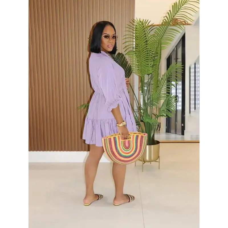 ? ?Flowing silhouette?? : The large flared design offers a dramatic look, making this dress perfect for those who seek standout fashion. ? ?Chic V-neckline?? : Features a fashionable V-neck that adds a touch of sophistication while enhancing your neckline's appearance. ? Three-quarter sleeves? : The seven-quarter length sleeves provide a balance between coverage and breathability, ideal for warm days. ? Woven fabric? : Crafted from moderate thickness woven fabric, this piece ensures durability while allowing comfort throughout the summer. ? Fitted waist? : The fitted waist accentuates your figure, providing a flattering shape that enhances your overall look.