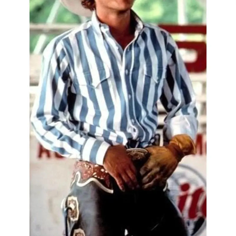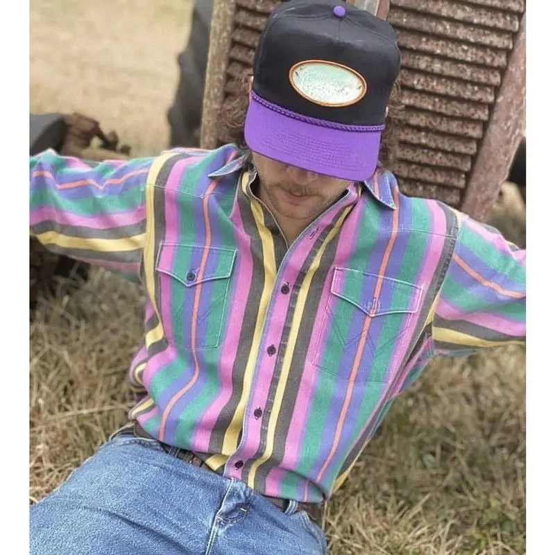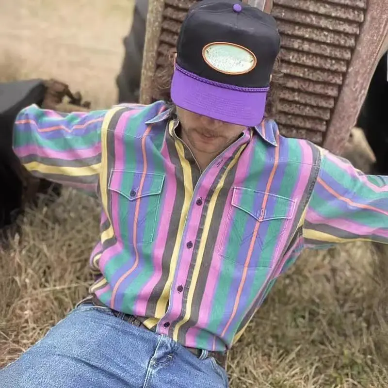 Men's Western Cowboy Style Retro Print Loose Long Sleeve Shirt Striped Casual Button Autumn Top Suitable for Streetwear Menswear233