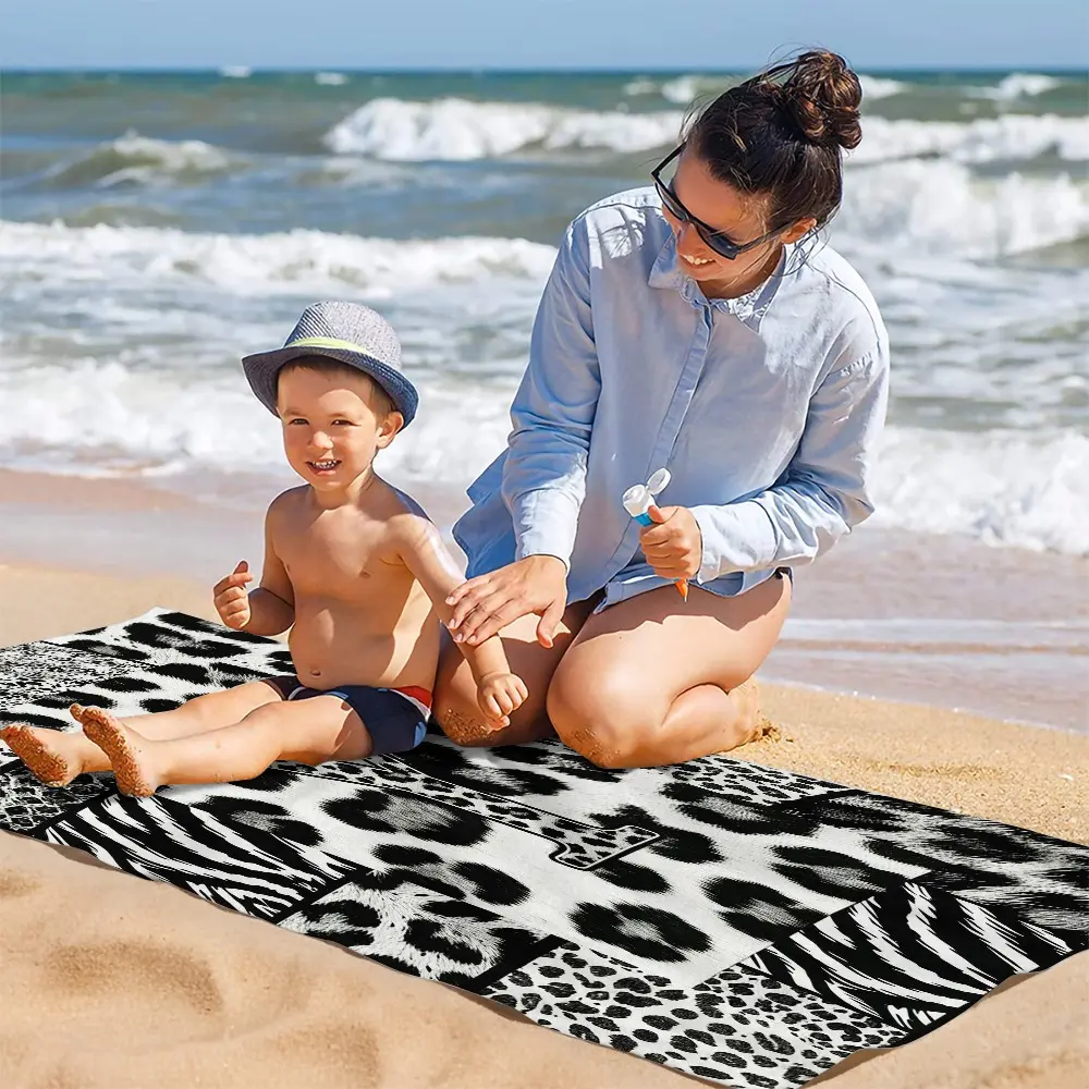 Leopard Print Letter Beach Towel, Black White Animal Patchwork Beach Blanket, Quick Dry Sand Free Bath Towel for Swimming Pool Camping, Monogram Initial Decor for Kids Teens Adults