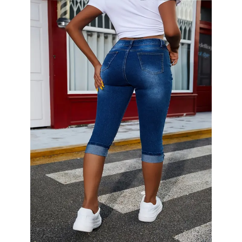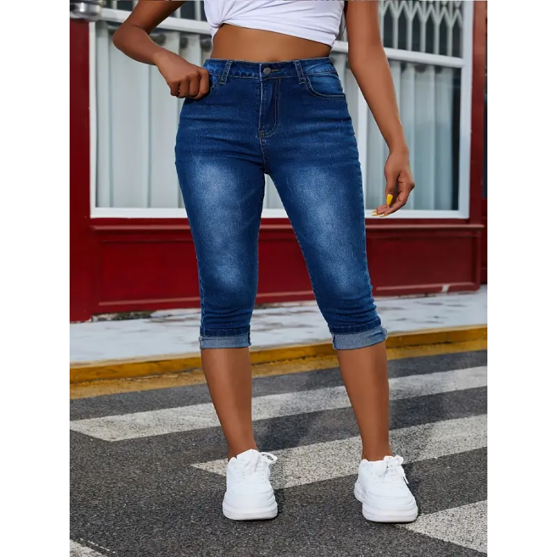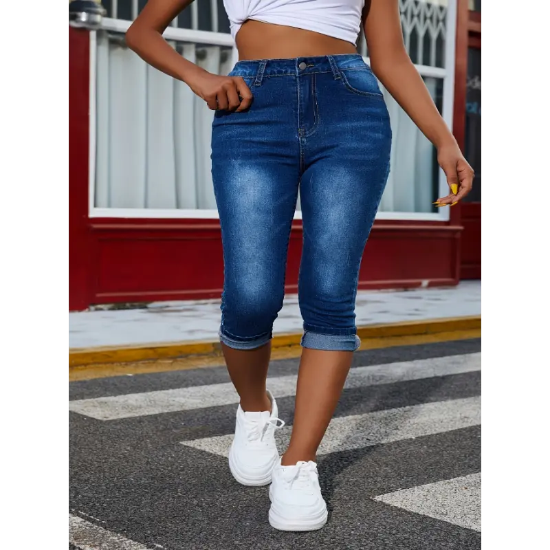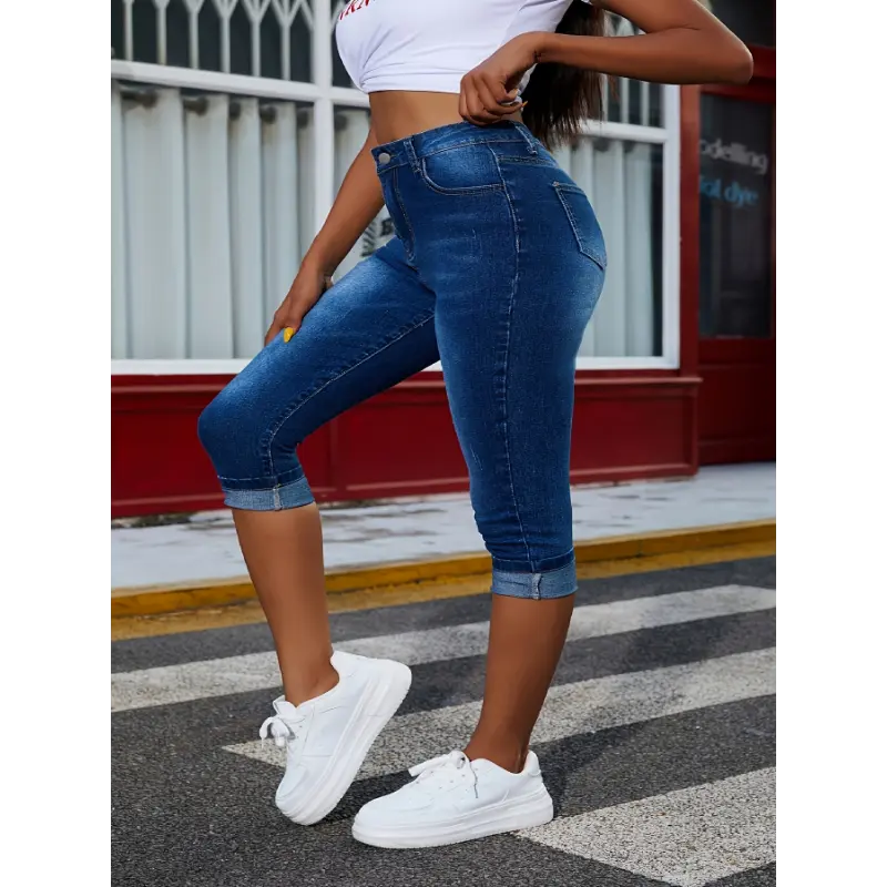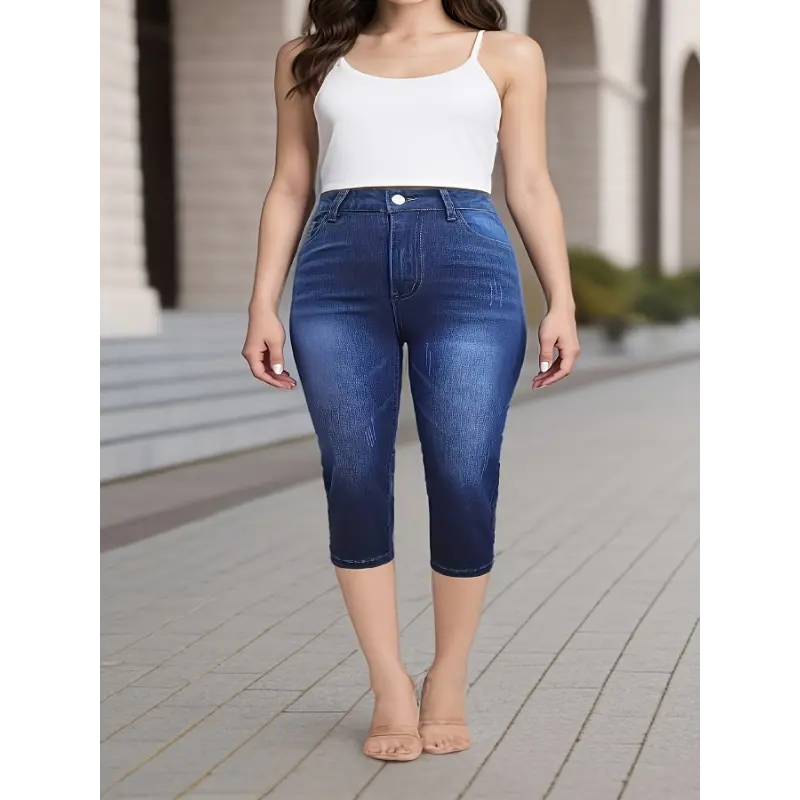 5. [Comfortable Fashion] Women's Plus Size High-Elasticity Capri Jeans - Stretchy & Comfortable, Mid-Calf Length with Rolled Hem, Slash Pockets, Zip Closure - Versatile Streetwear Style in Light Blue, Plus Size Jeans